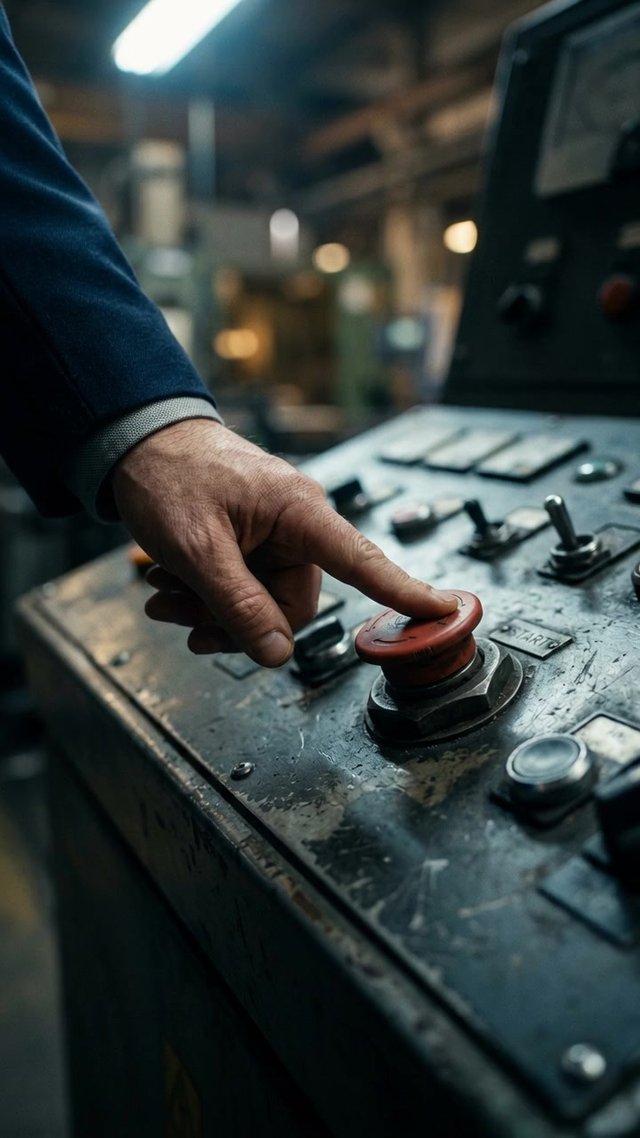 Крупный план руки в костюме, нажимающей тяжёлую, промышленную кнопку на п...