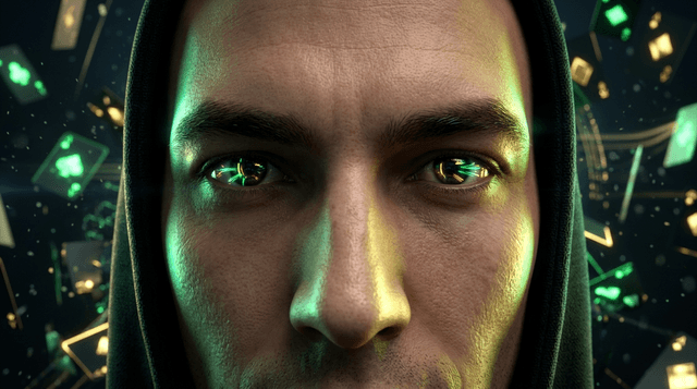 Slow motion zoom in on the eyes, flying playing cards spinning smoothly in the background, dynamic neon reflections shifting on the face ...