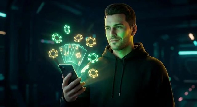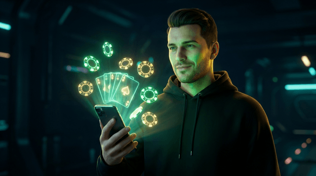 Camera pans smoothly around the man holding the phone, holographic chips and cards float up from the screen in 3D, glowing neon lights pu...