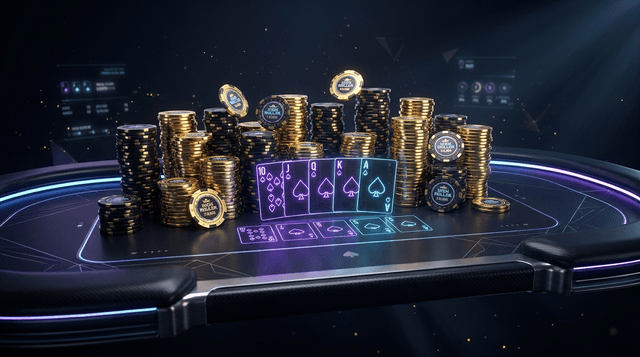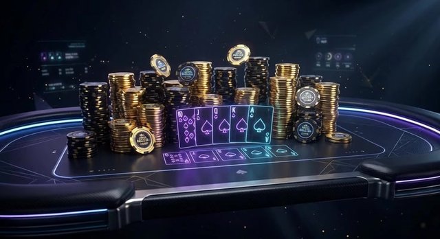 Strong rule: style --- Premium cinematic 3D motion graphics, neon and ... ---. A luxurious virtual 3D poker table floating in a dark stud...