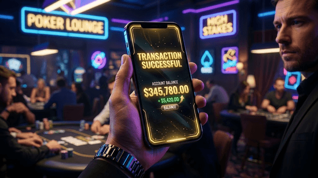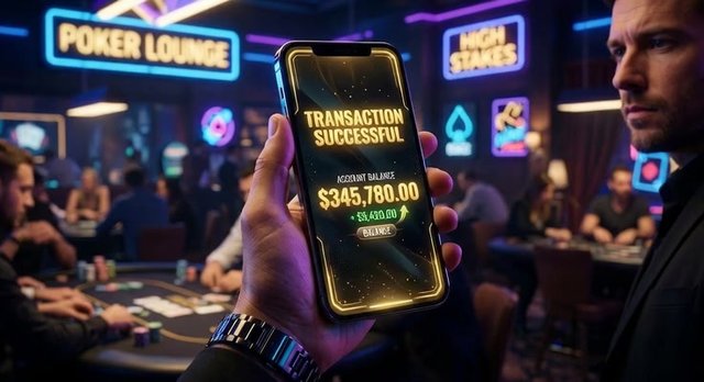 The camera smoothly glides from a close-up of the glowing smartphone screen showing a rapid balance increase to Alex's face. He wears a c...