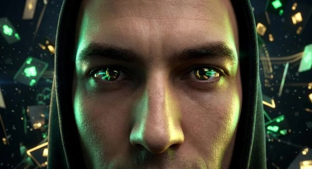 Art style: Premium cinematic 3D motion graphics, neon and .... Extreme close-up of a confident man's eyes (Alex), neon green and gold li...