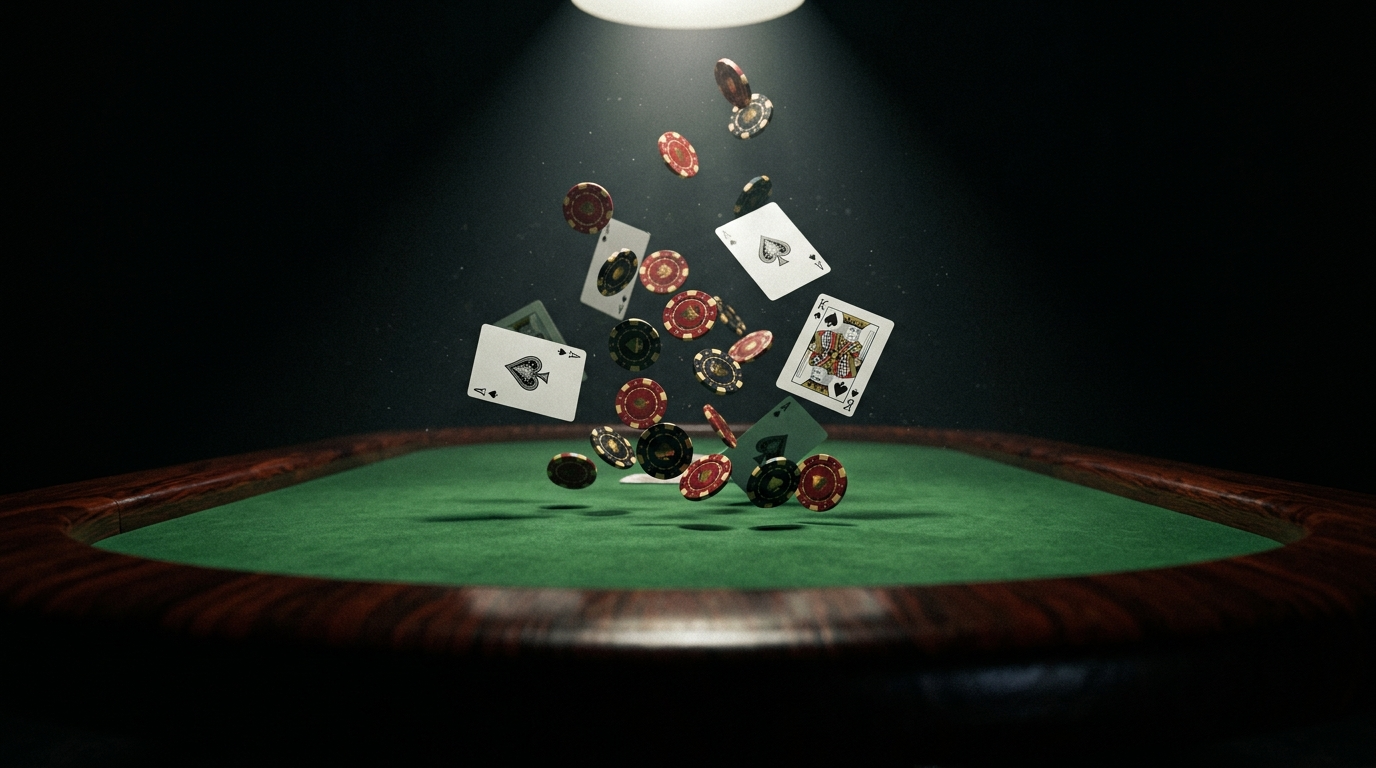 Карты и фишки падают невероятно медленно. Камера совершает очень медленный наезд на центр стола. От карт исходит едва заметное золотое св...