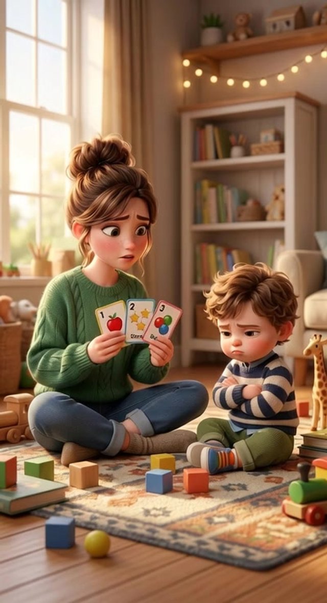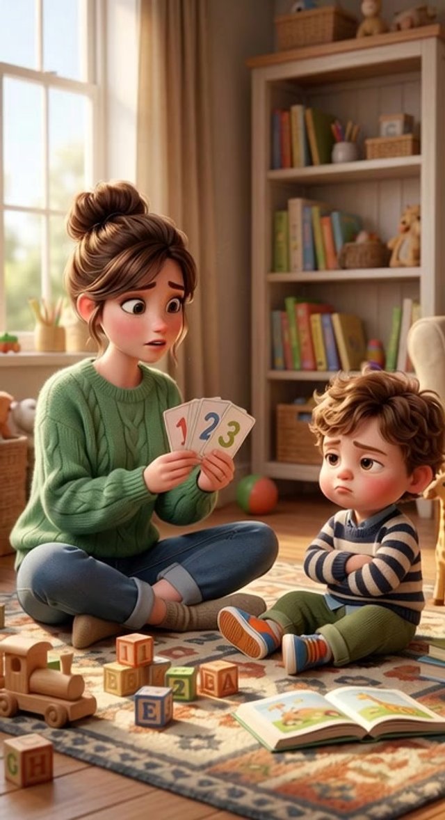 Средний план. Мать поднимает карточку. Малыш немного отстраняется и мягко качает головой. Плавное панорамирование камеры. Малыш говорит д...