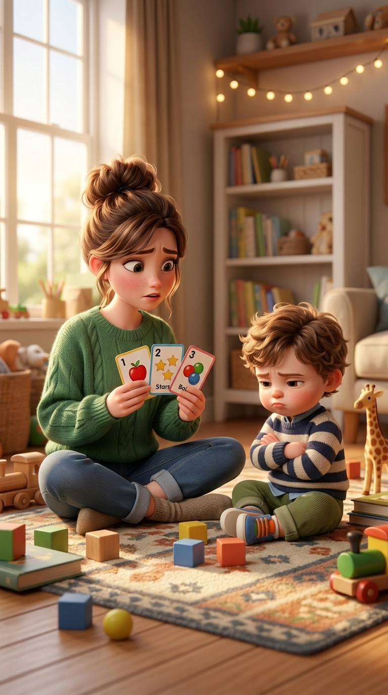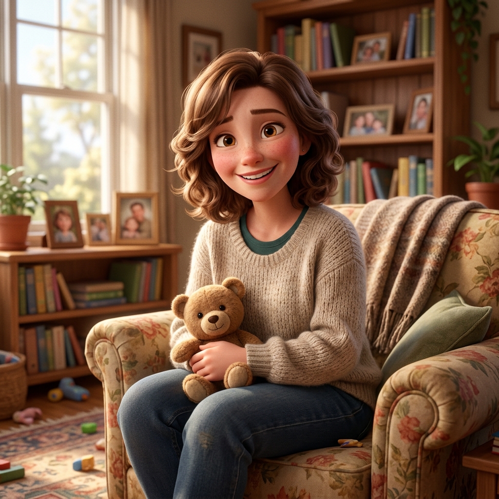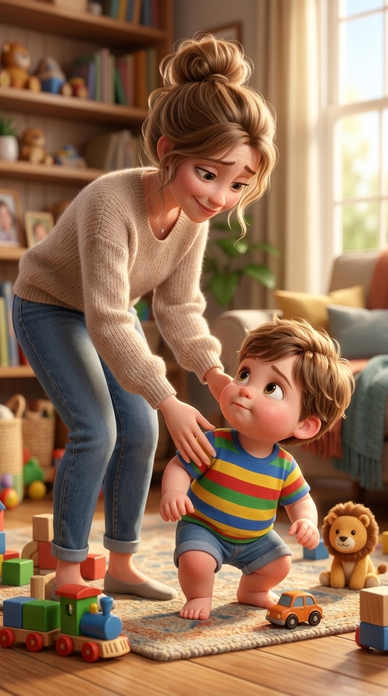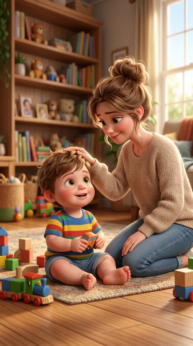 Strong rule: style --- 3D Pixar Animation, cinematic lighting, masterp... ---. A young beautiful mother in her 20s, kind face, warm smile...