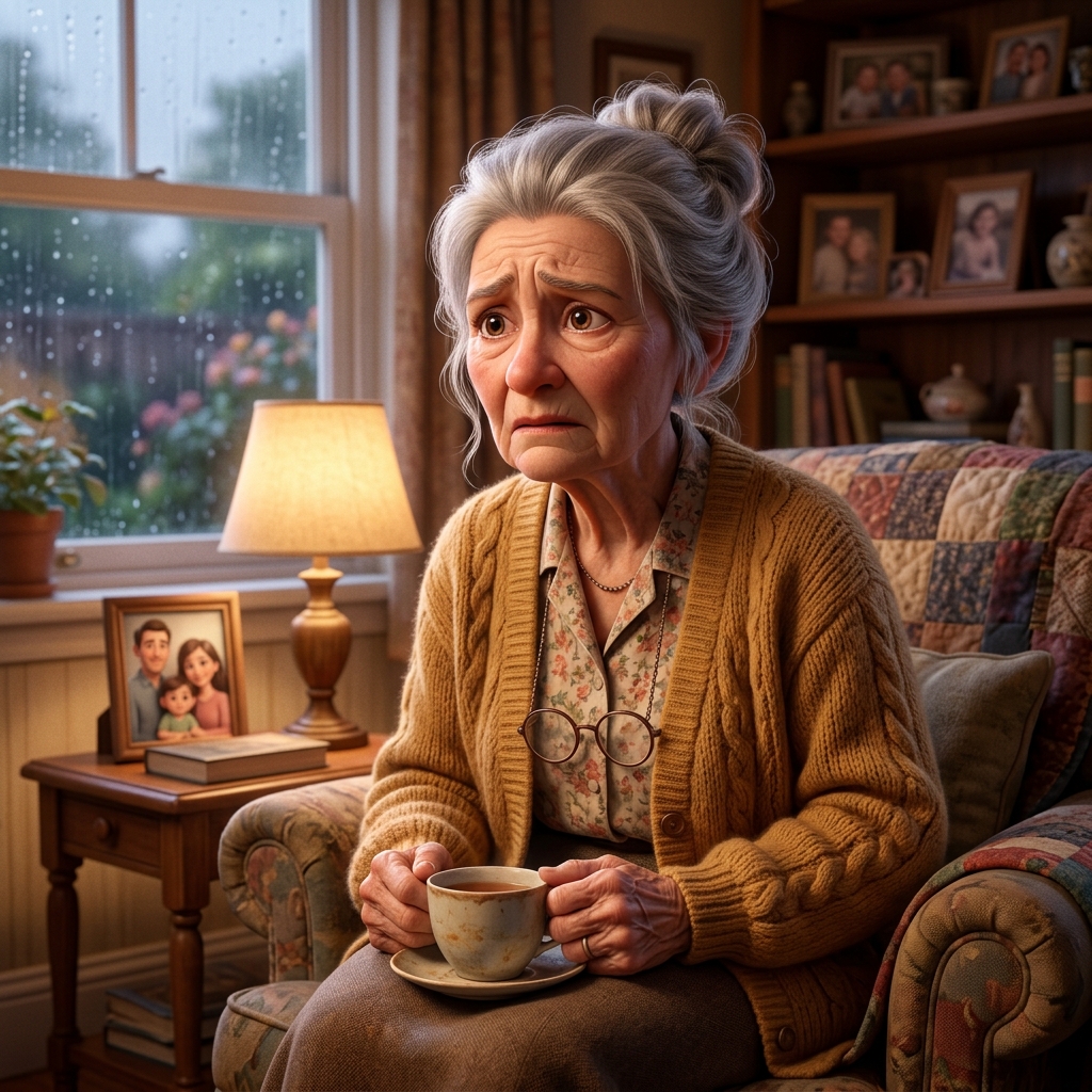 Strong rule: style --- 3D Pixar Animation, cinematic lighting, masterp... ---. An older woman, grandmother, wearing a cozy cardigan, worr...