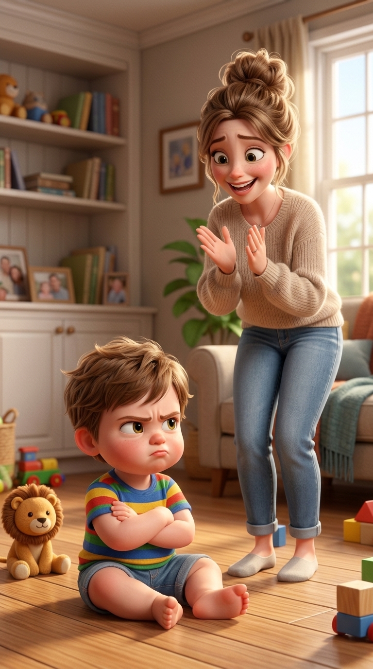 The mother claps her hands cheerfully, while the camera slowly pans to the toddler who crosses his arms with a grumpy, unimpressed facial...