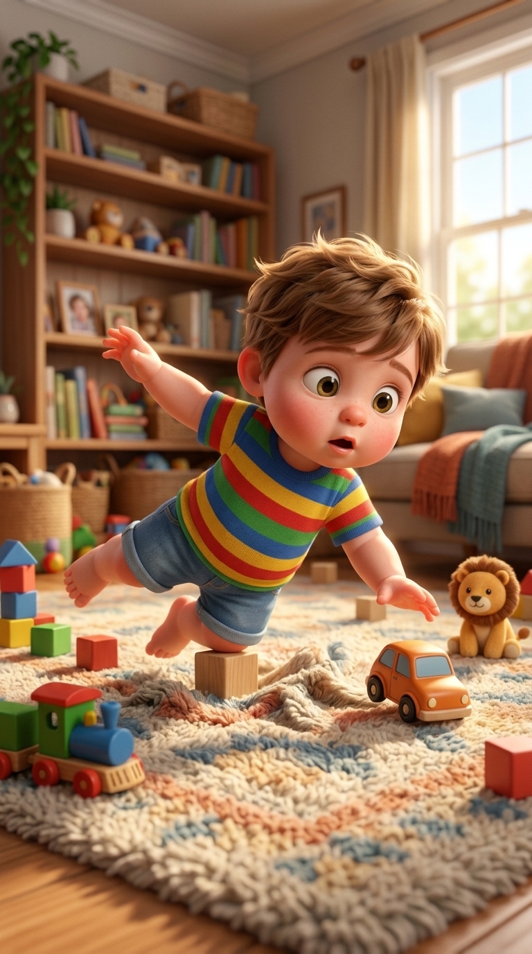 Милый полуторагодовалый малыш идёт по комнате, запинается и падает на пол...