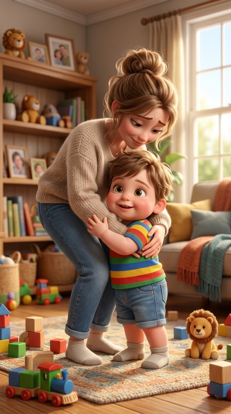 A heartwarming slow hug between the mother and the toddler. Soft camera orbit around them.
