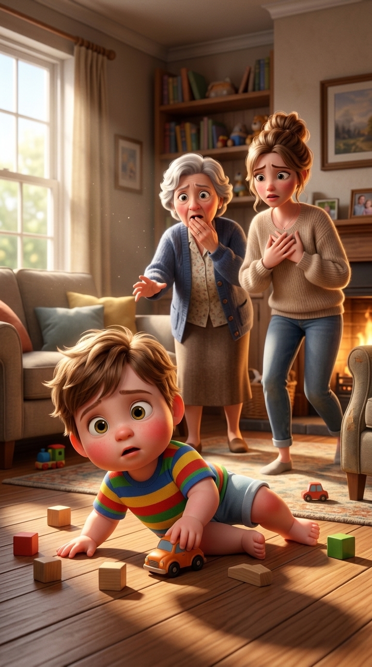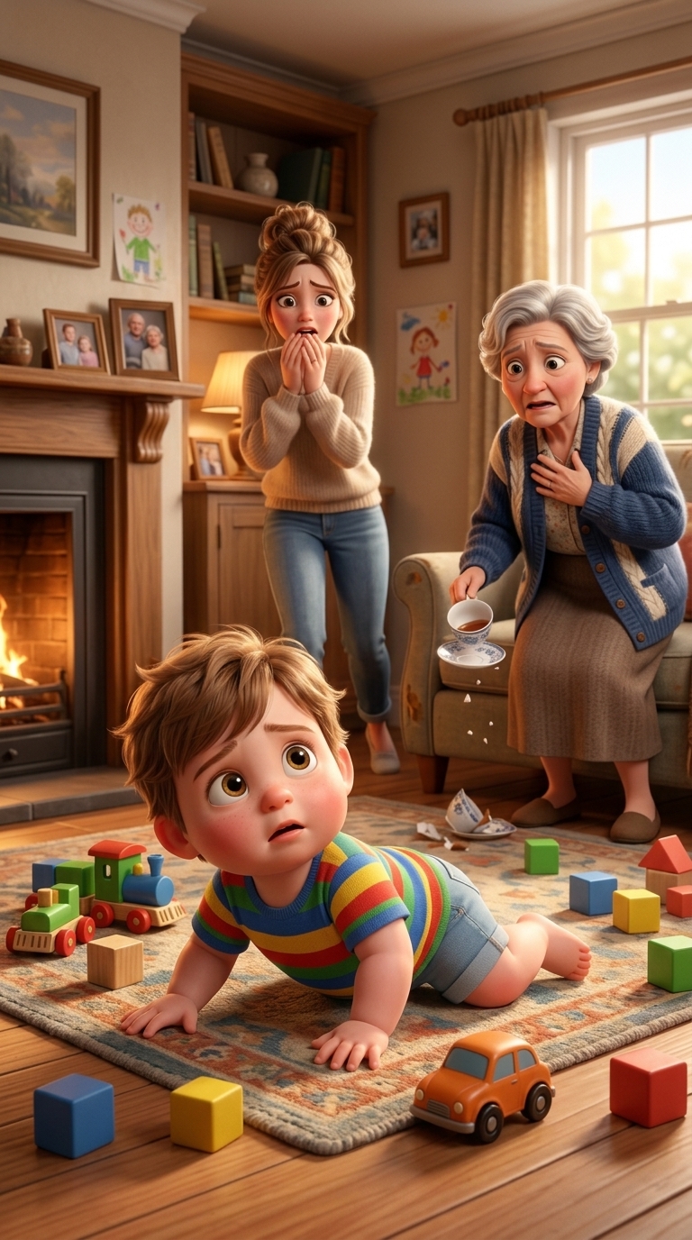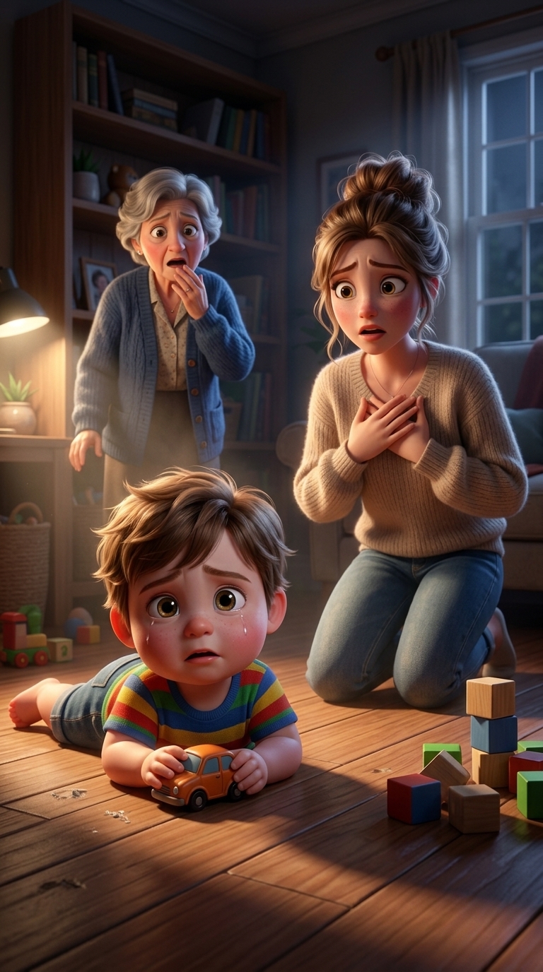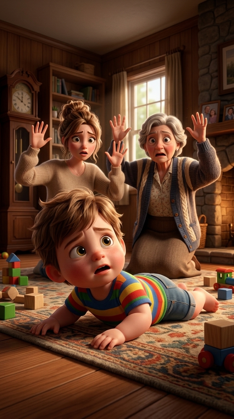 Камера фокусируется на испуганном лице малыша на полу, в то время как размытые взрослые на заднем плане суетливо движутся. Легкий наезд н...