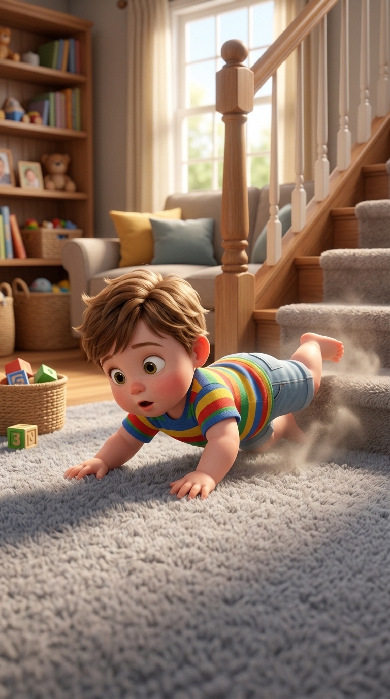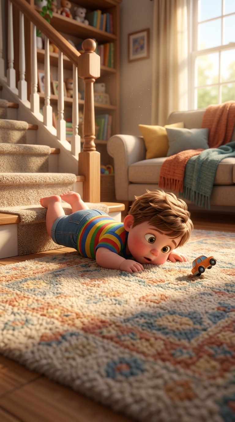 Малыш спускается со ступеньки на ступеньку вниз по лестнице, внизу на последней ступеньке он падает вперед на живот, лицом вниз на ковер....