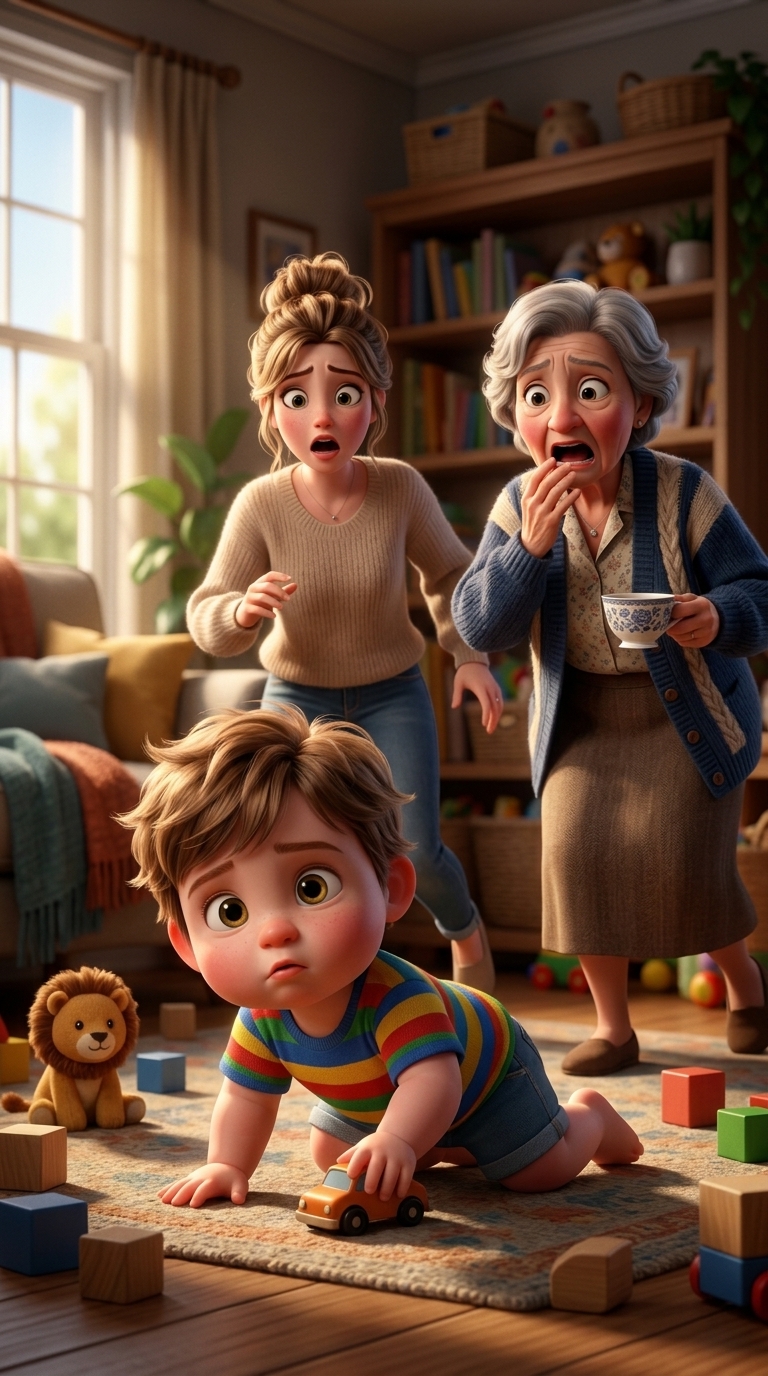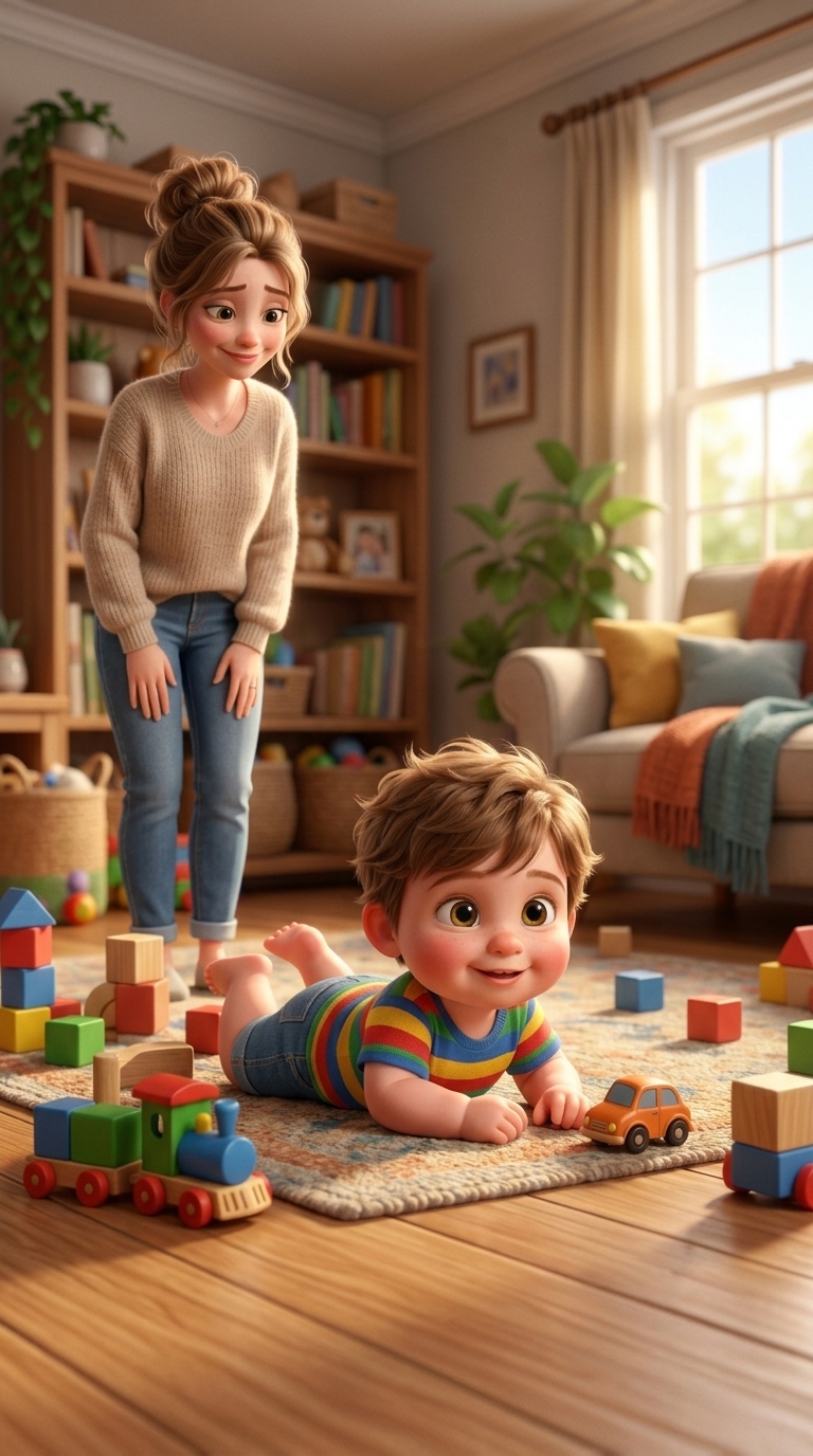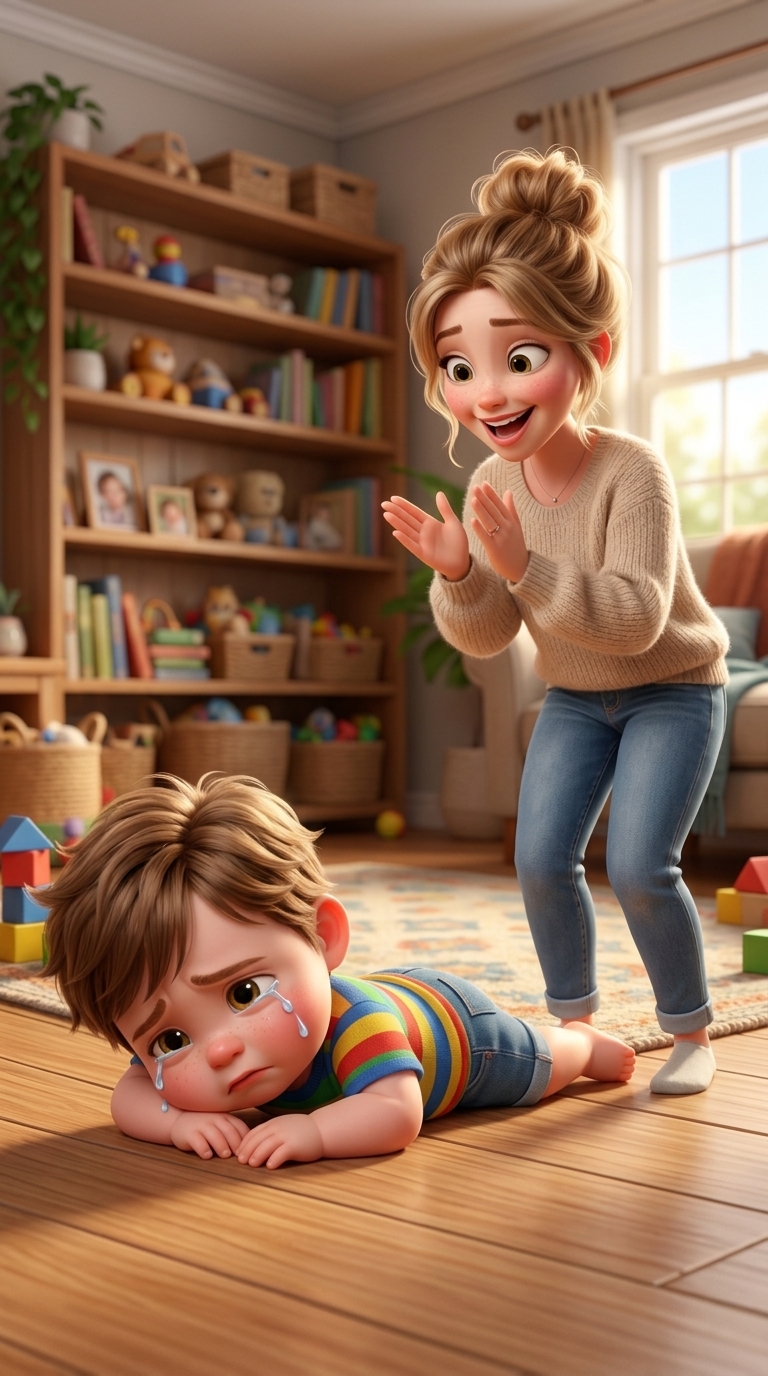 Мама весело хлопает в ладоши, пока камера медленно поворачивается к малышу, который лежит на полу с грустным выражением на лице. Малыш го...