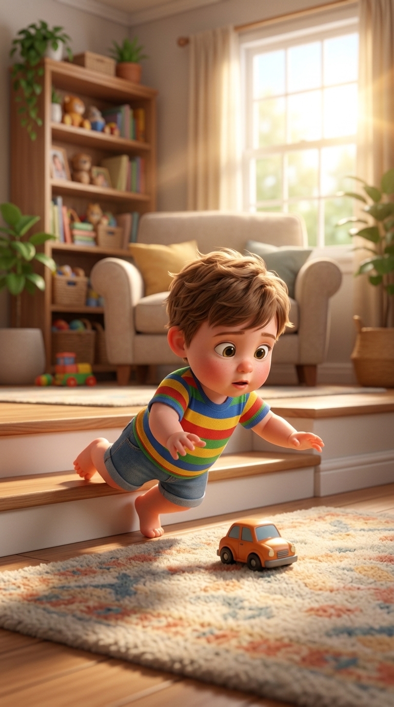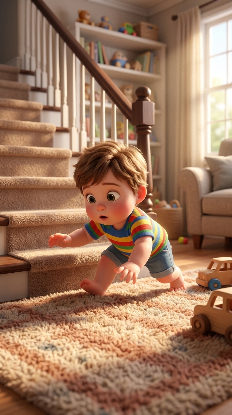 Малыш спускается по ступеням и на последней ступеньке неуклюже падает вперед на ковер. Плавное слежение камеры.