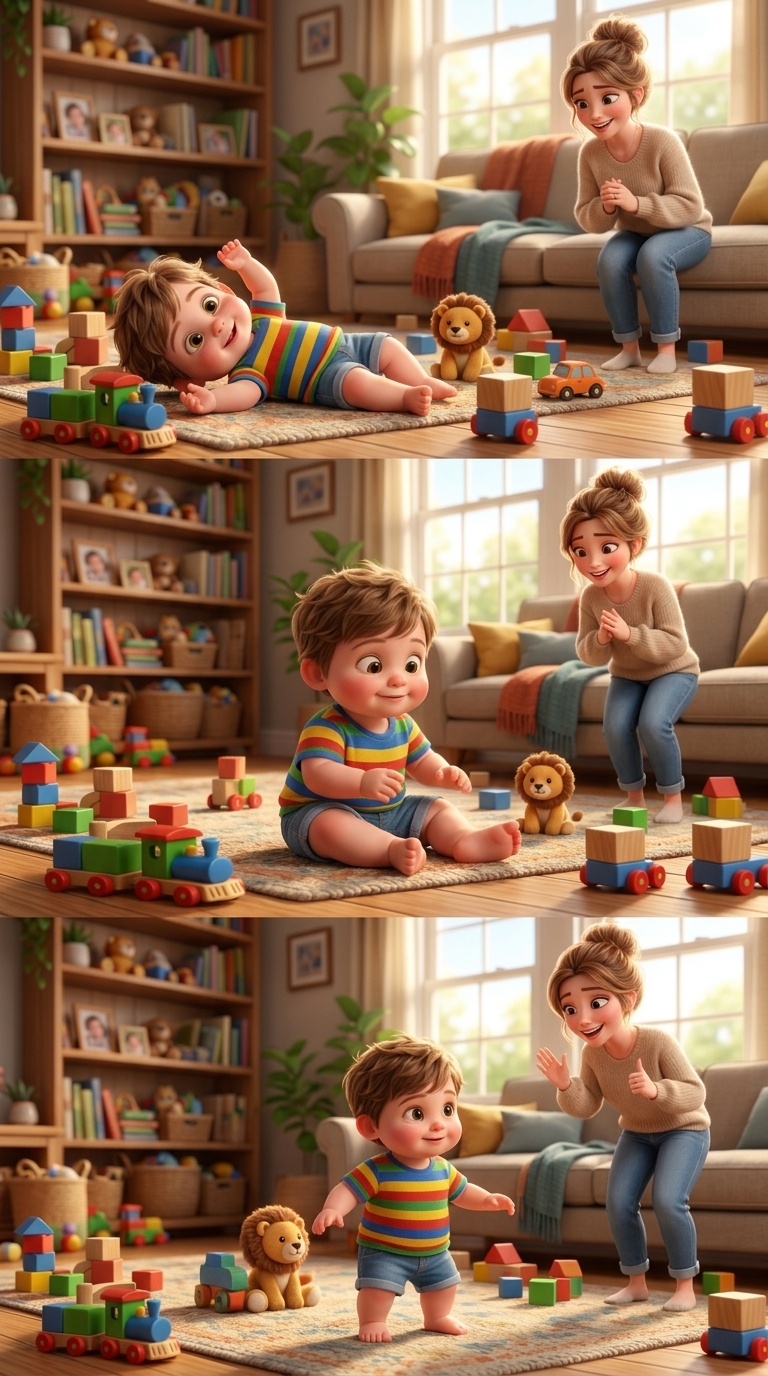 Малыш садится на пол и поднимается с пола, чтобы встать на собственные ноги. Мать ободряюще смотрит на малыша. Торжествующее настроение.
