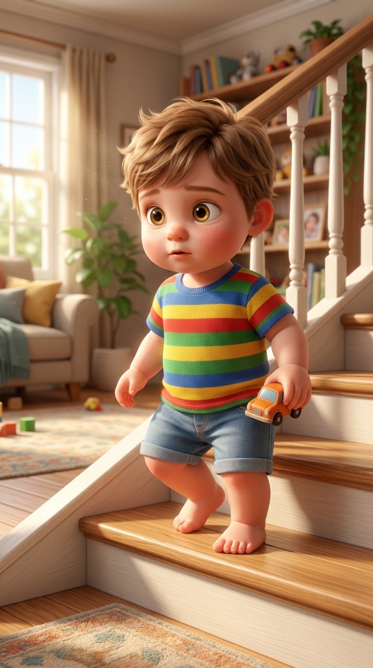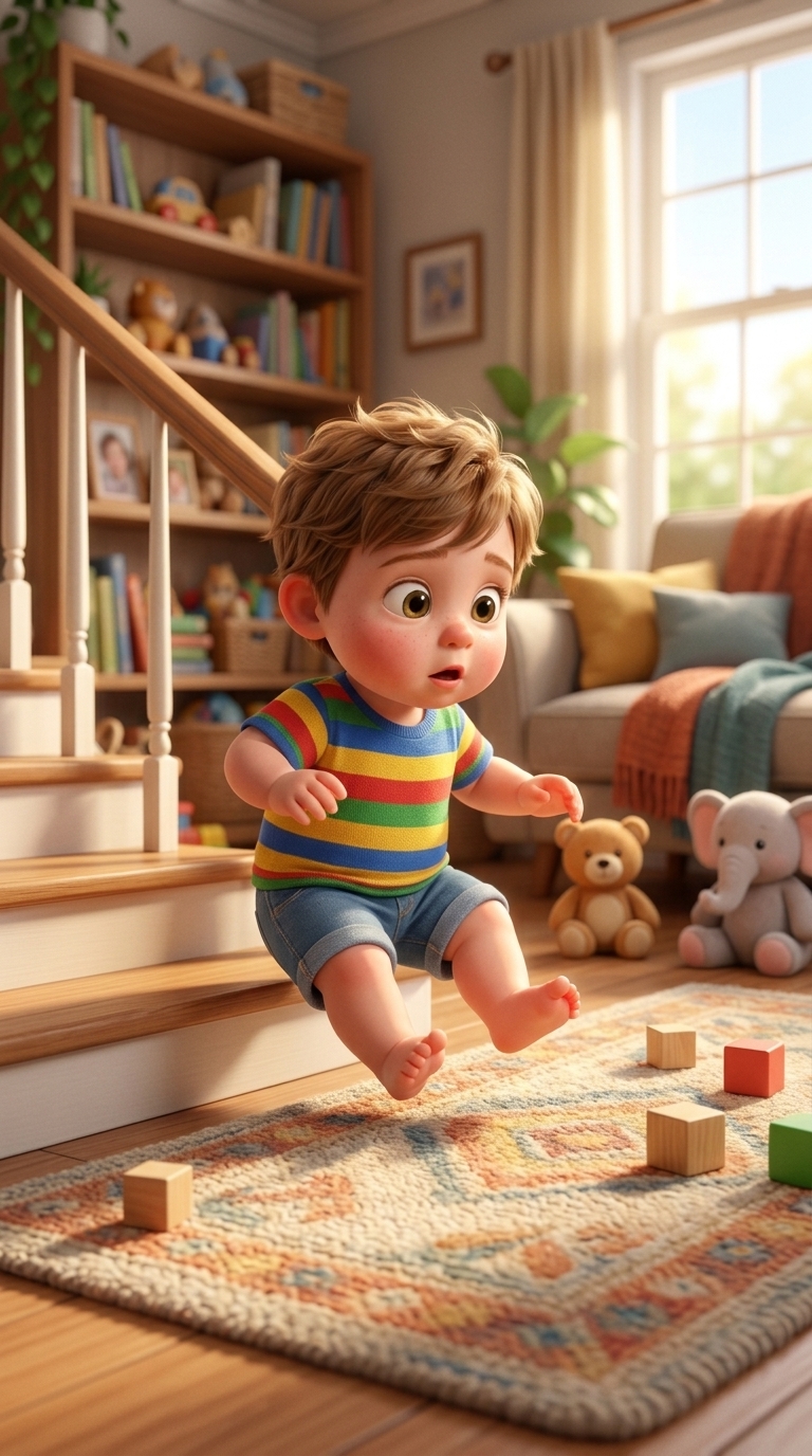 Малыш спускается со ступеньки на ступеньку вниз по лестнице, на последней ступеньке лестницы в самом низу он спотыкается и падает вперед...