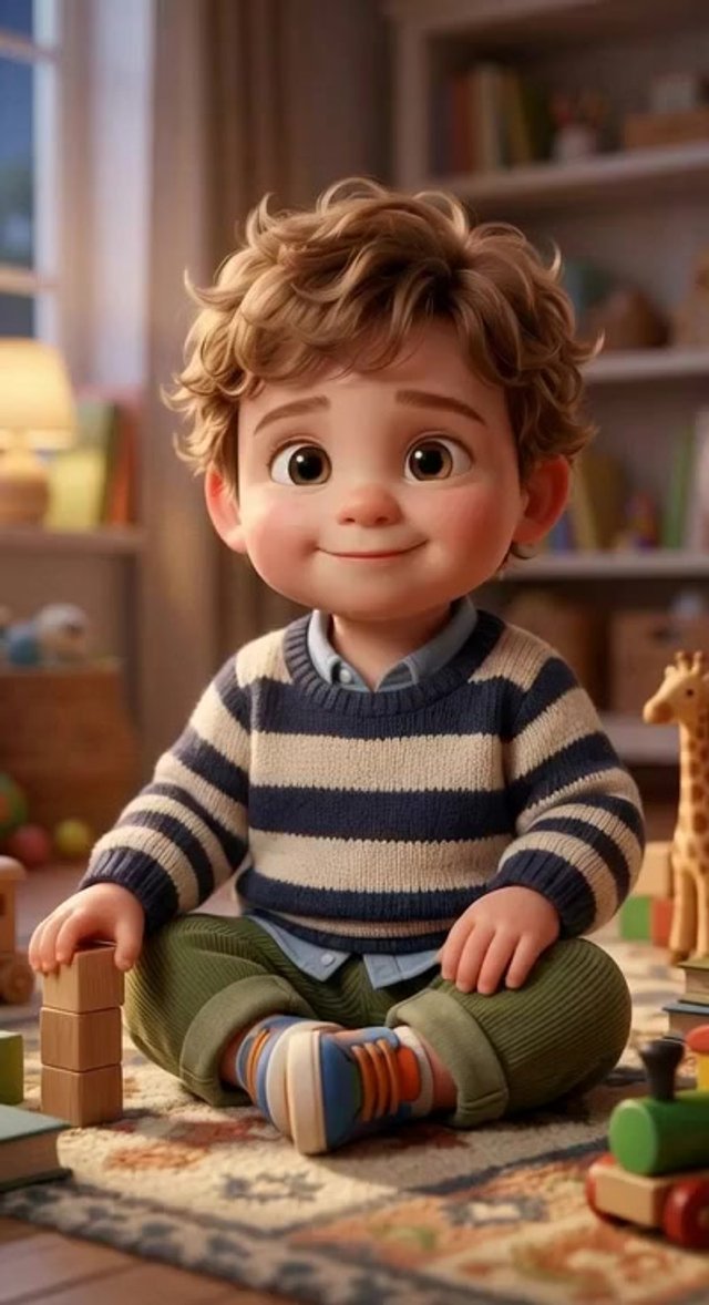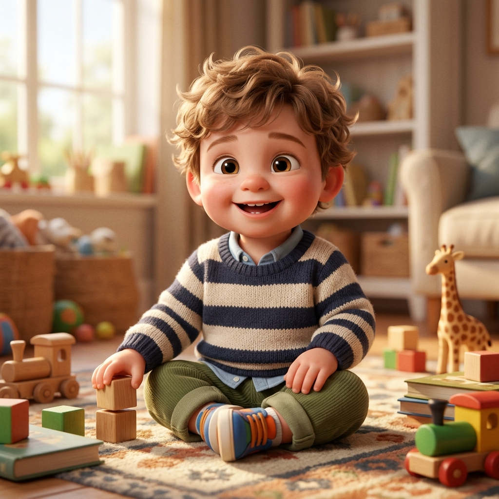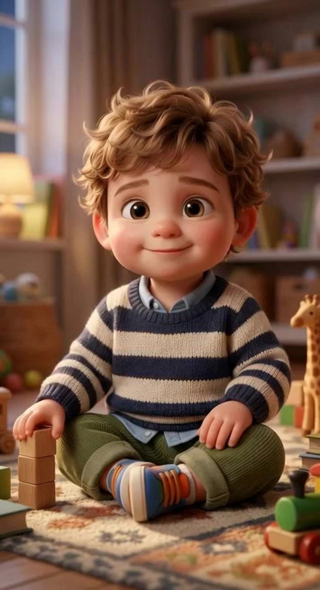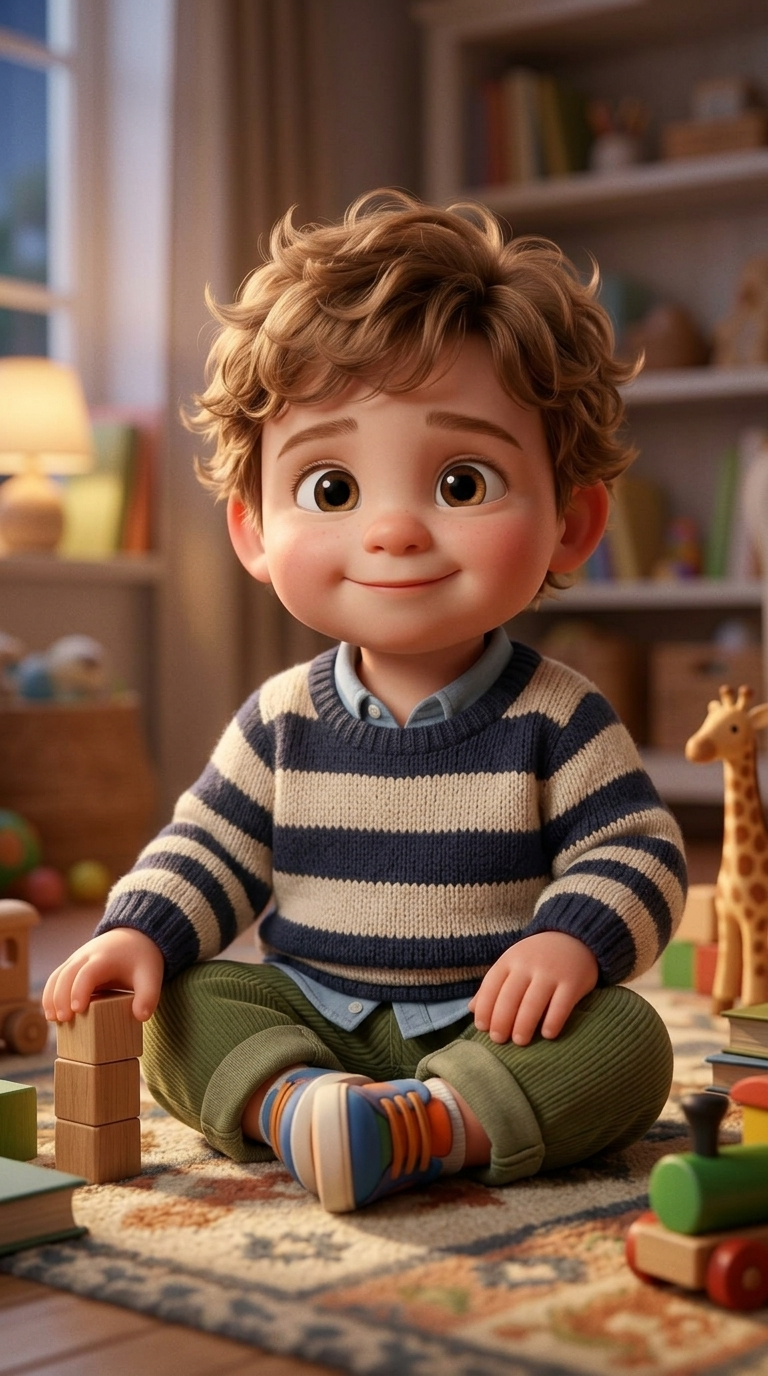 Strong rule: style --- 3D Pixar style, cinematic lighting, highly deta... ---. Cute 2-year-old toddler boy sitting on the floor in a cozy...