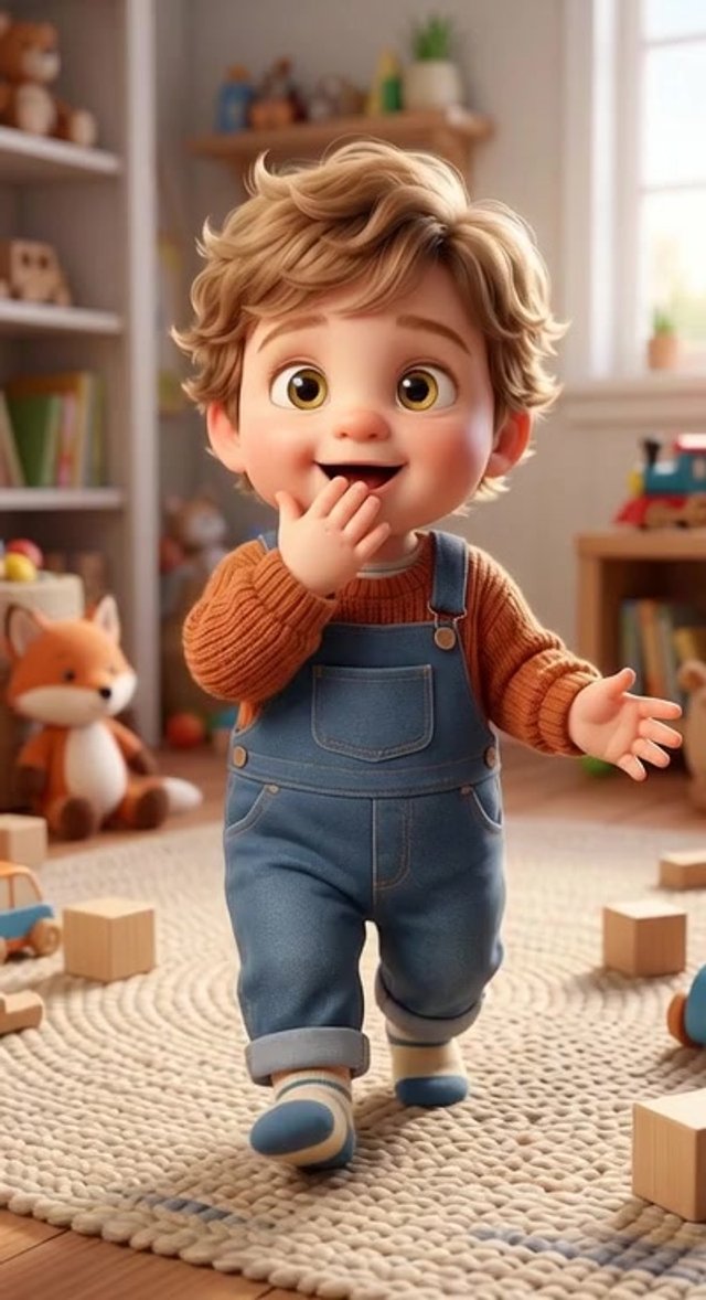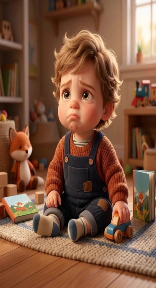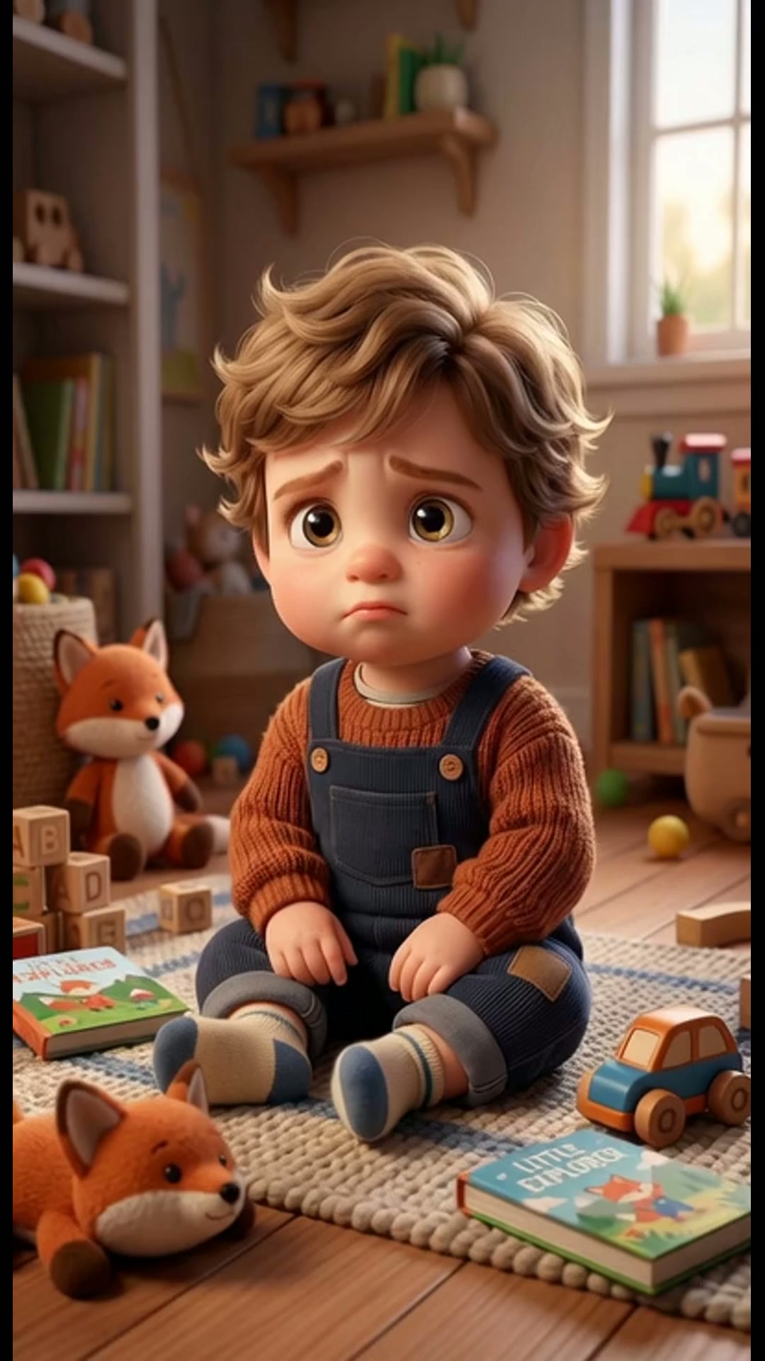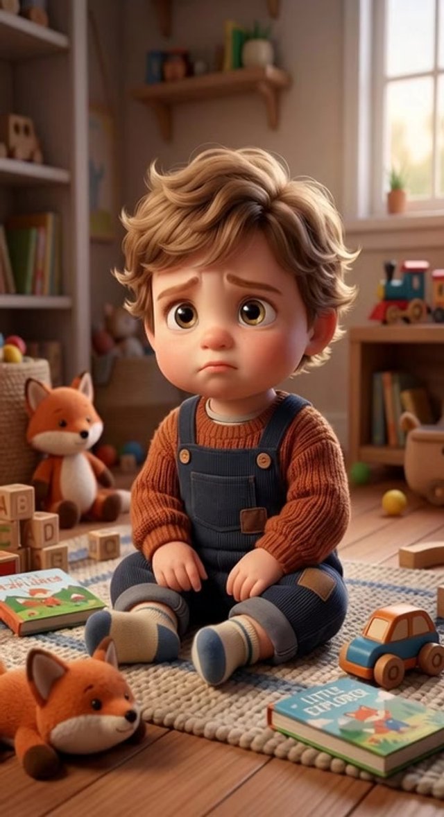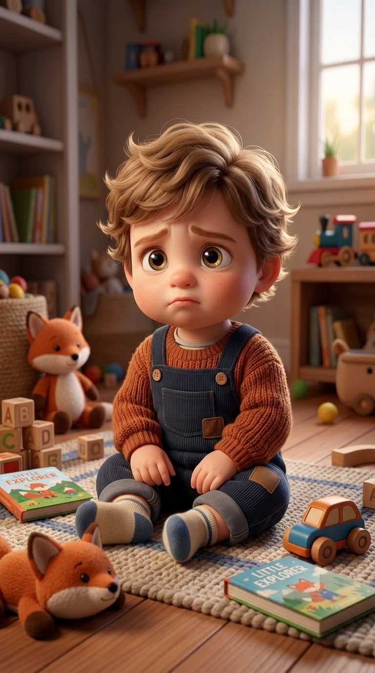 Strong rule: style --- 3D Pixar style, cinematic lighting, highly deta... ---. Cute 2-year-old toddler boy sitting on the floor in a cozy...