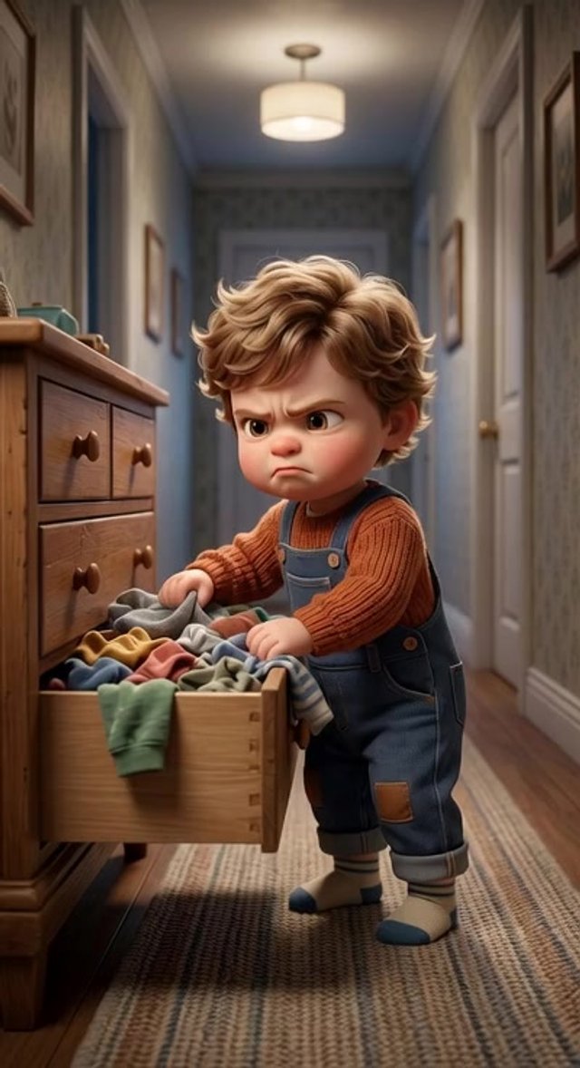 Toddler rummages through the drawer with little hands, frowns, and throws his hands down in frustration. Dynamic camera angle.