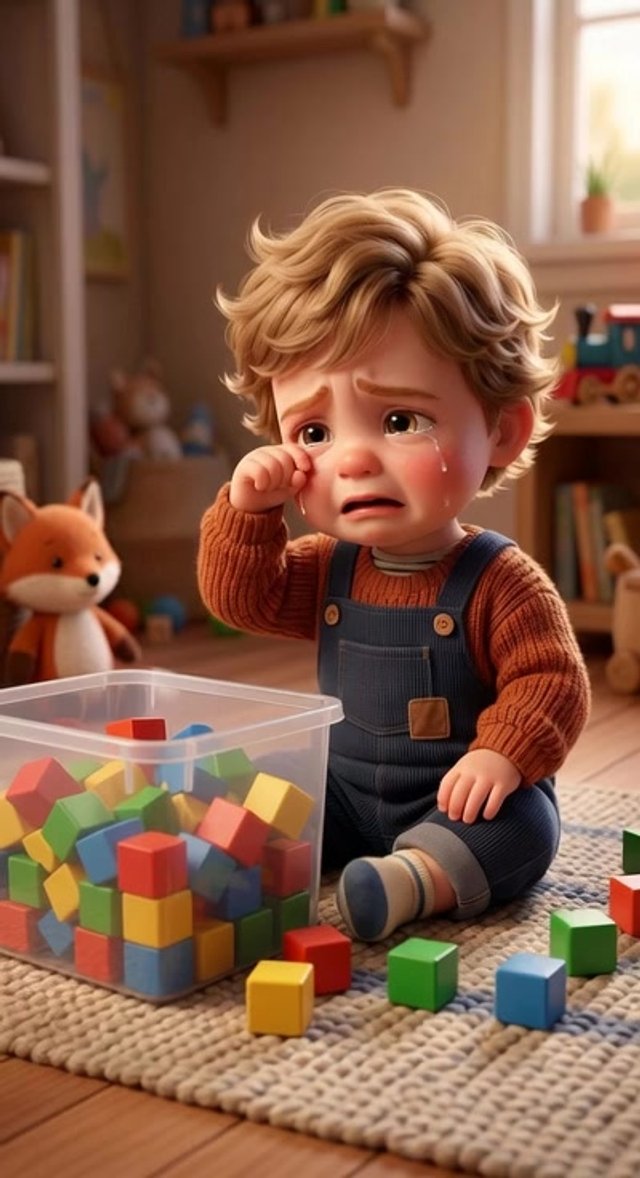 Toddler rubs his eyes while crying, looking at the messy blocks, slow dolly movement, emotional moment.