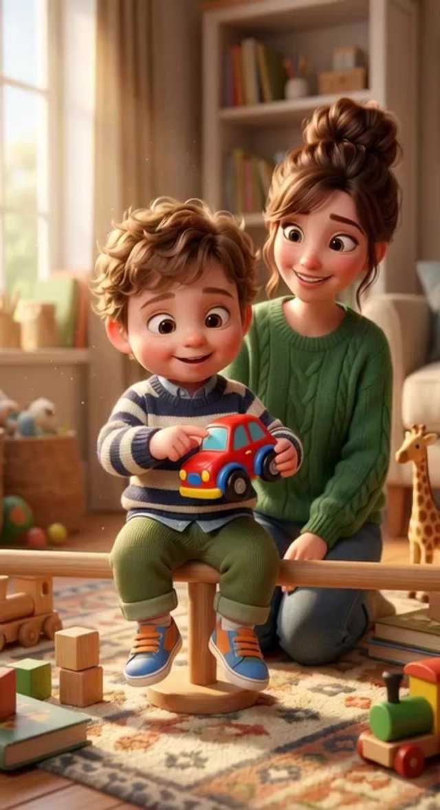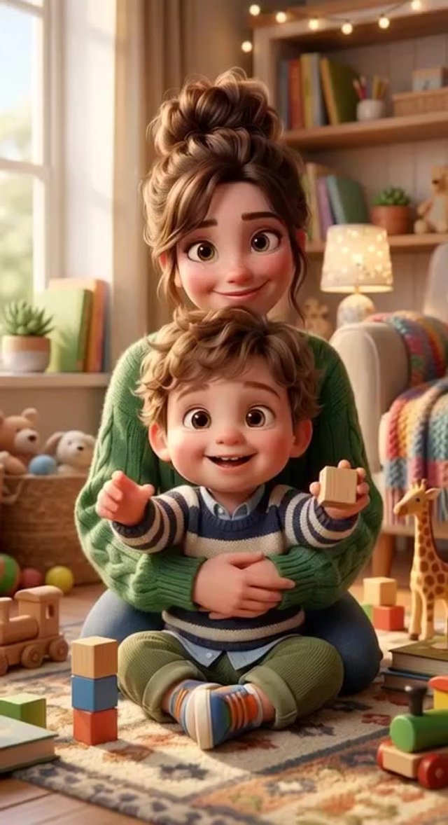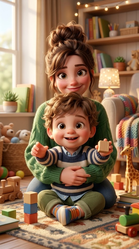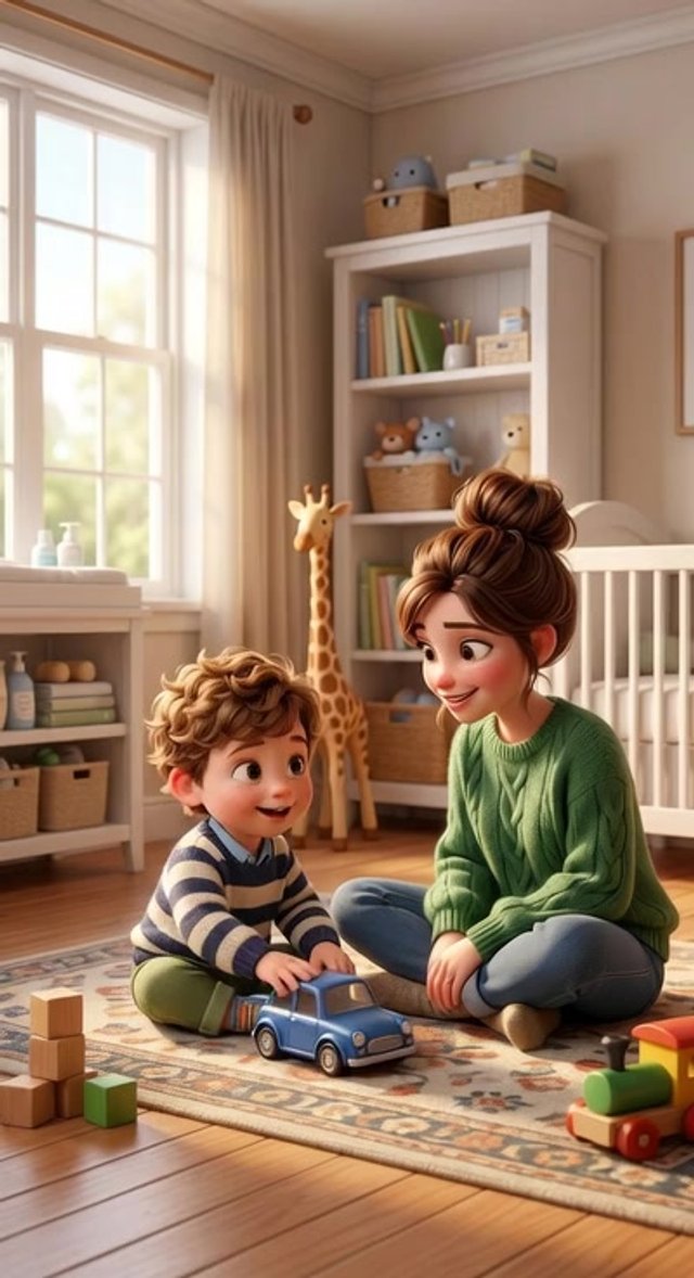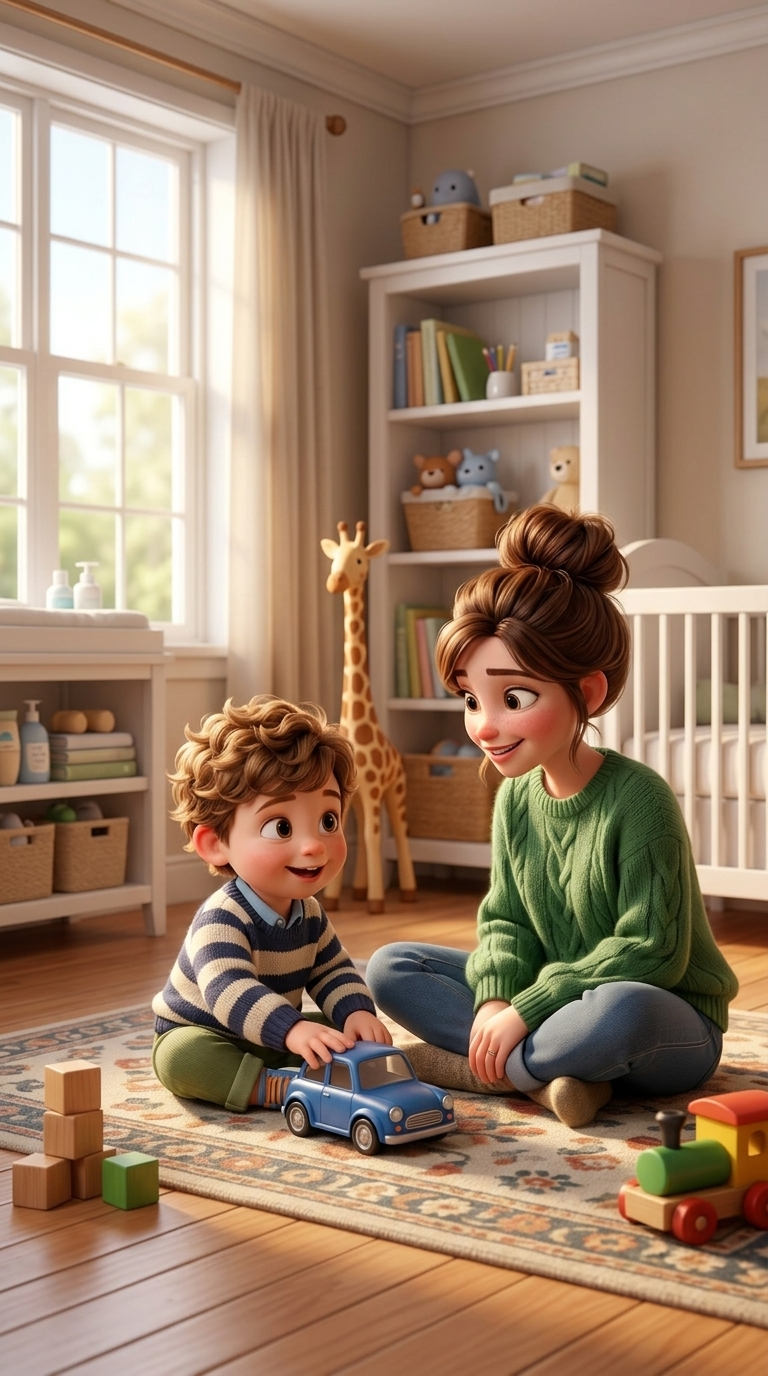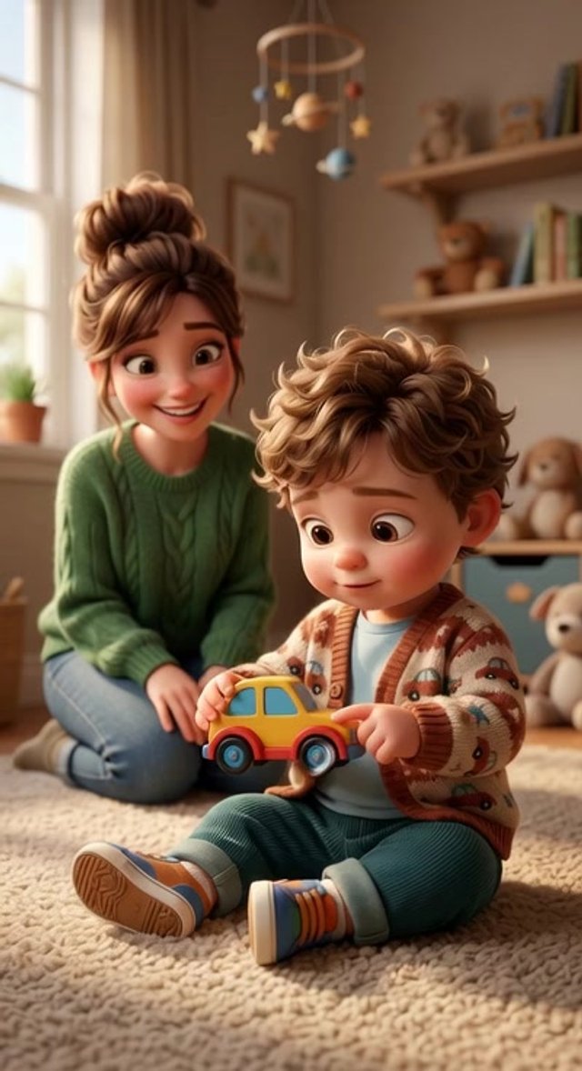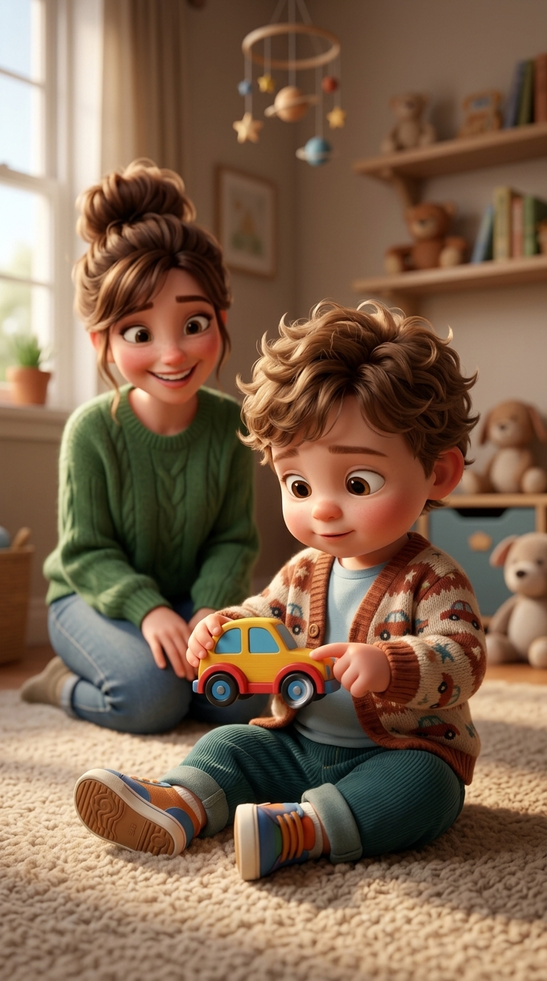 Strong rule: style --- 3D Pixar animation, cinematic lighting, highly ... ---. A cozy nursery. A young mother sits on the floor showing c...