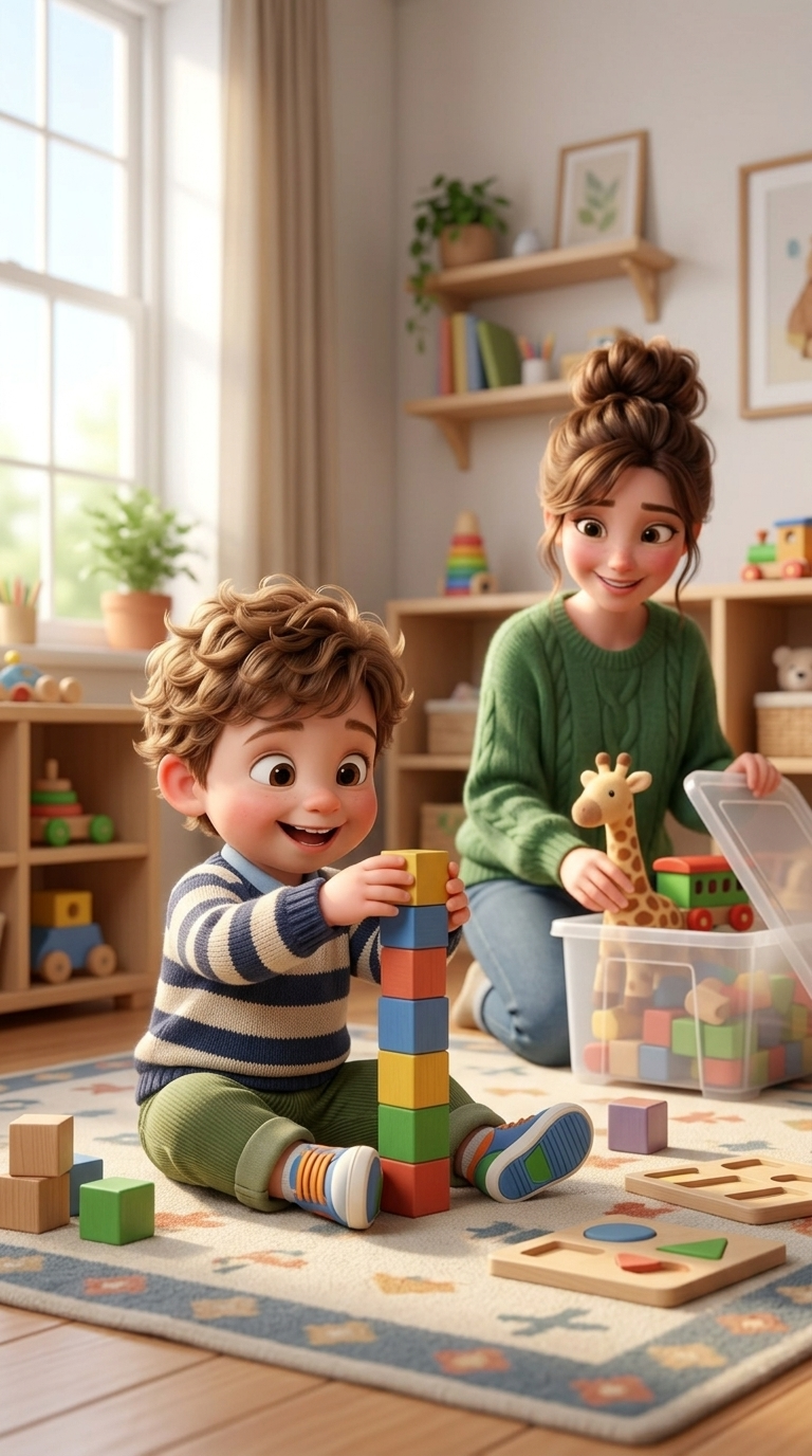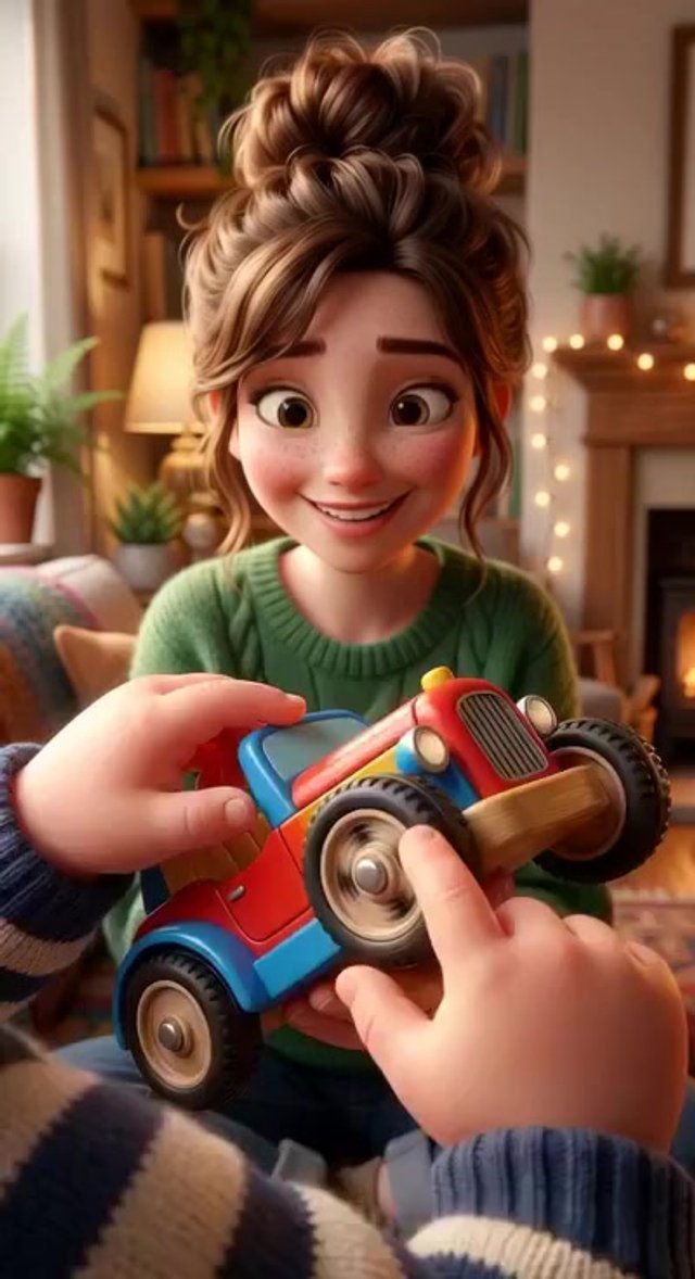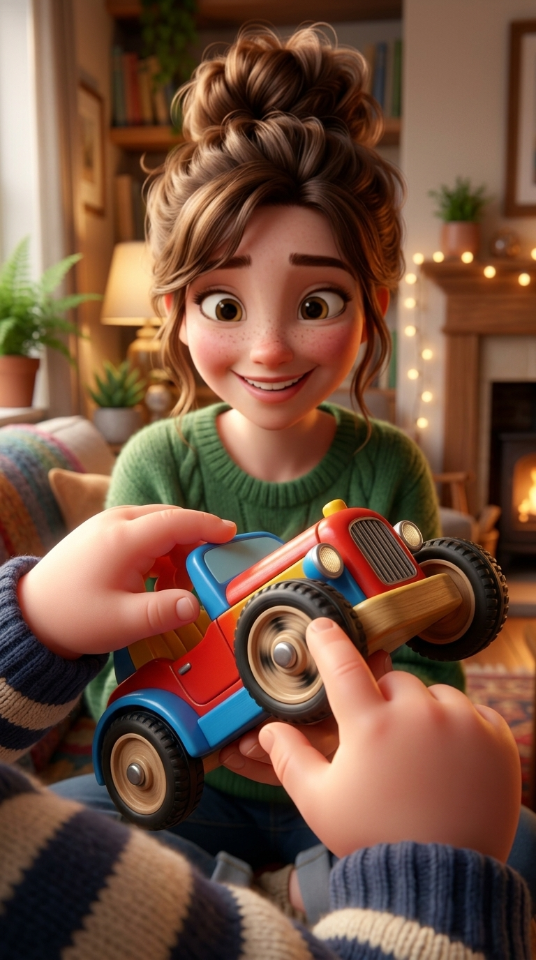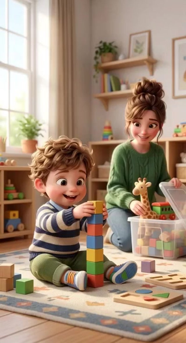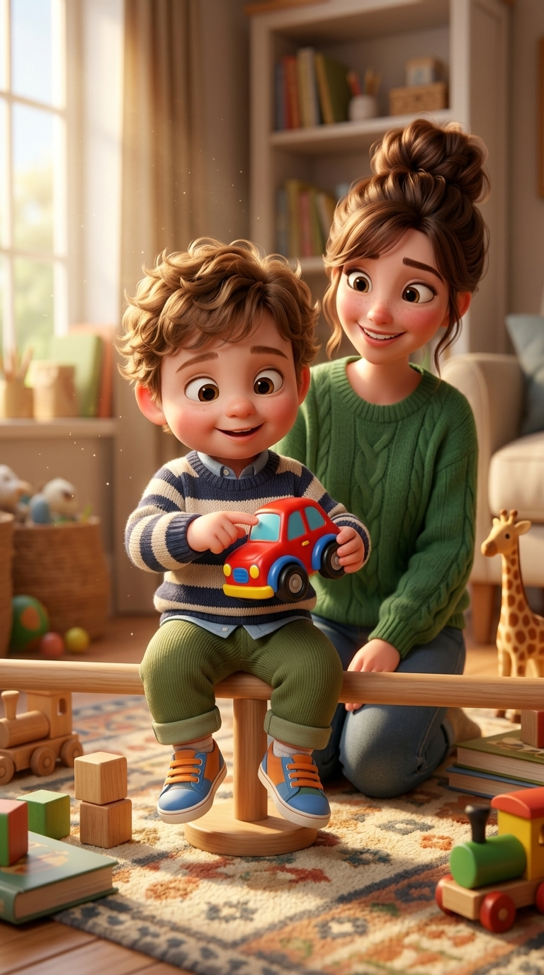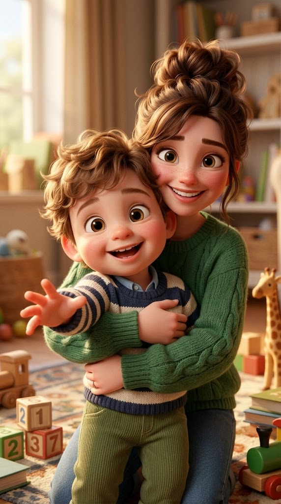 Strong rule: style --- 3D Pixar animation, cinematic lighting, highly ... ---. A cozy nursery. A young mother sits on the floor showing c...