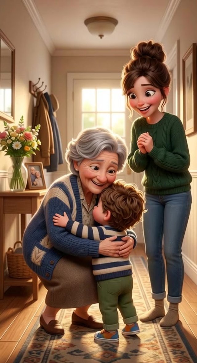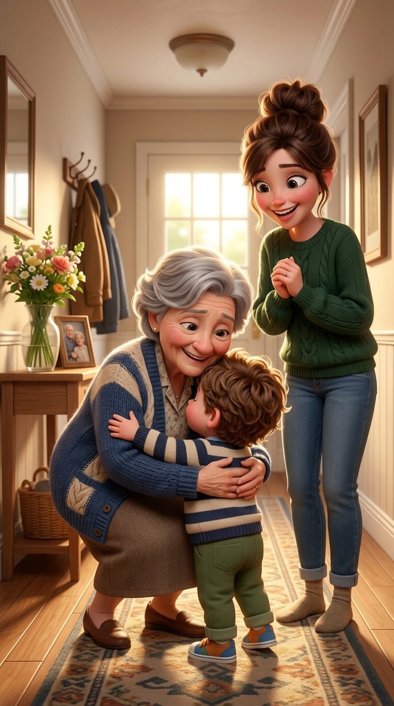 A bright, welcoming hallway. A kind grandmother is bending down to warmly...
