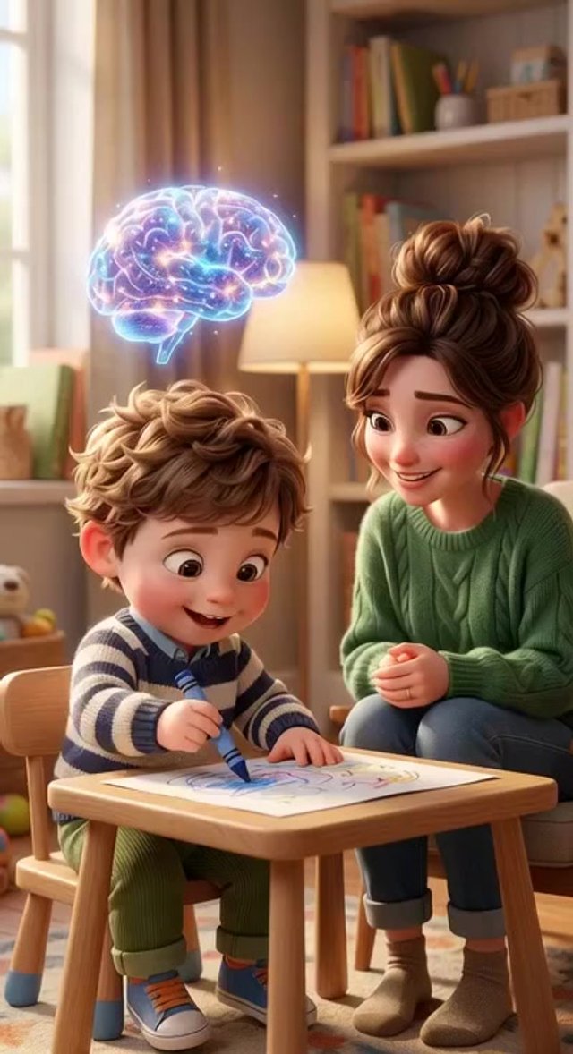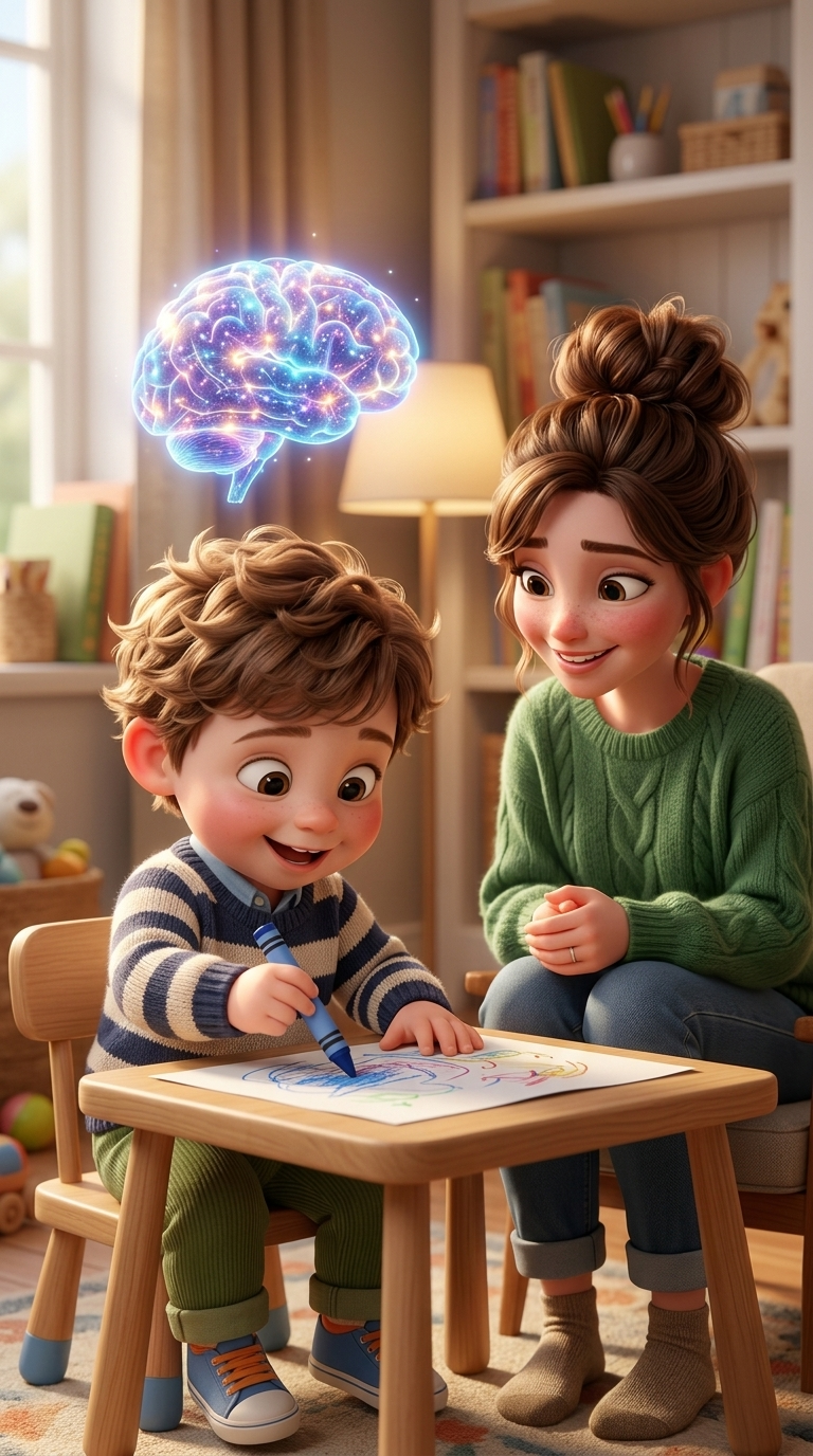 Medium shot. The toddler draws vigorously with crayons. Magical glowing neural connections light up in the holographic brain above his he...