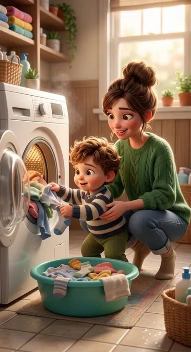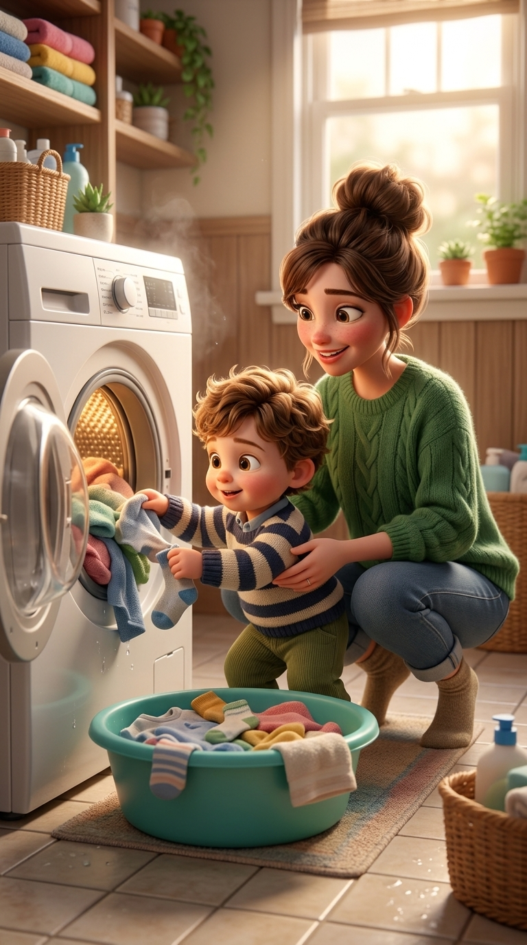 Medium shot. The toddler actively pulls a piece of clothing from the washing machine and drops it into the basin. The mother gently guide...