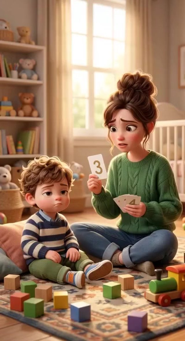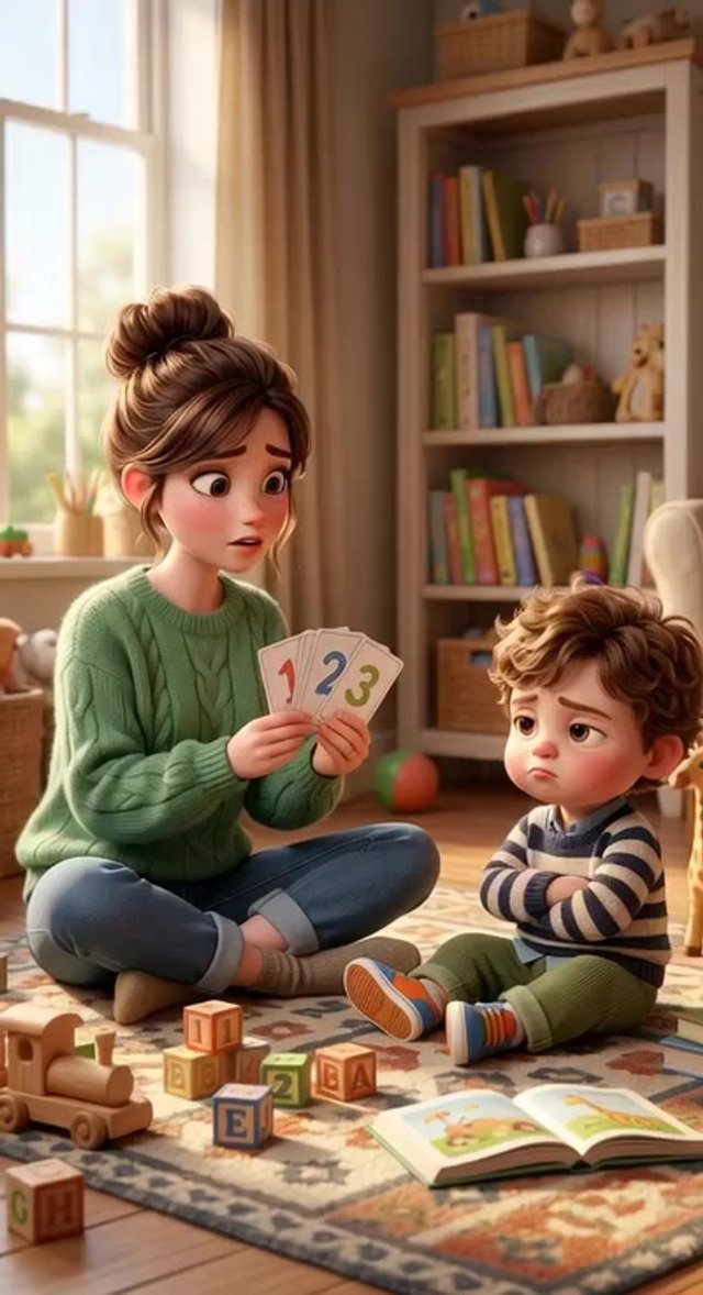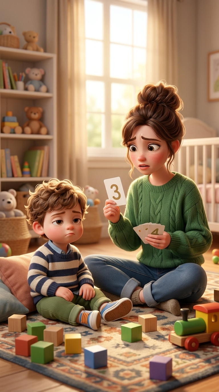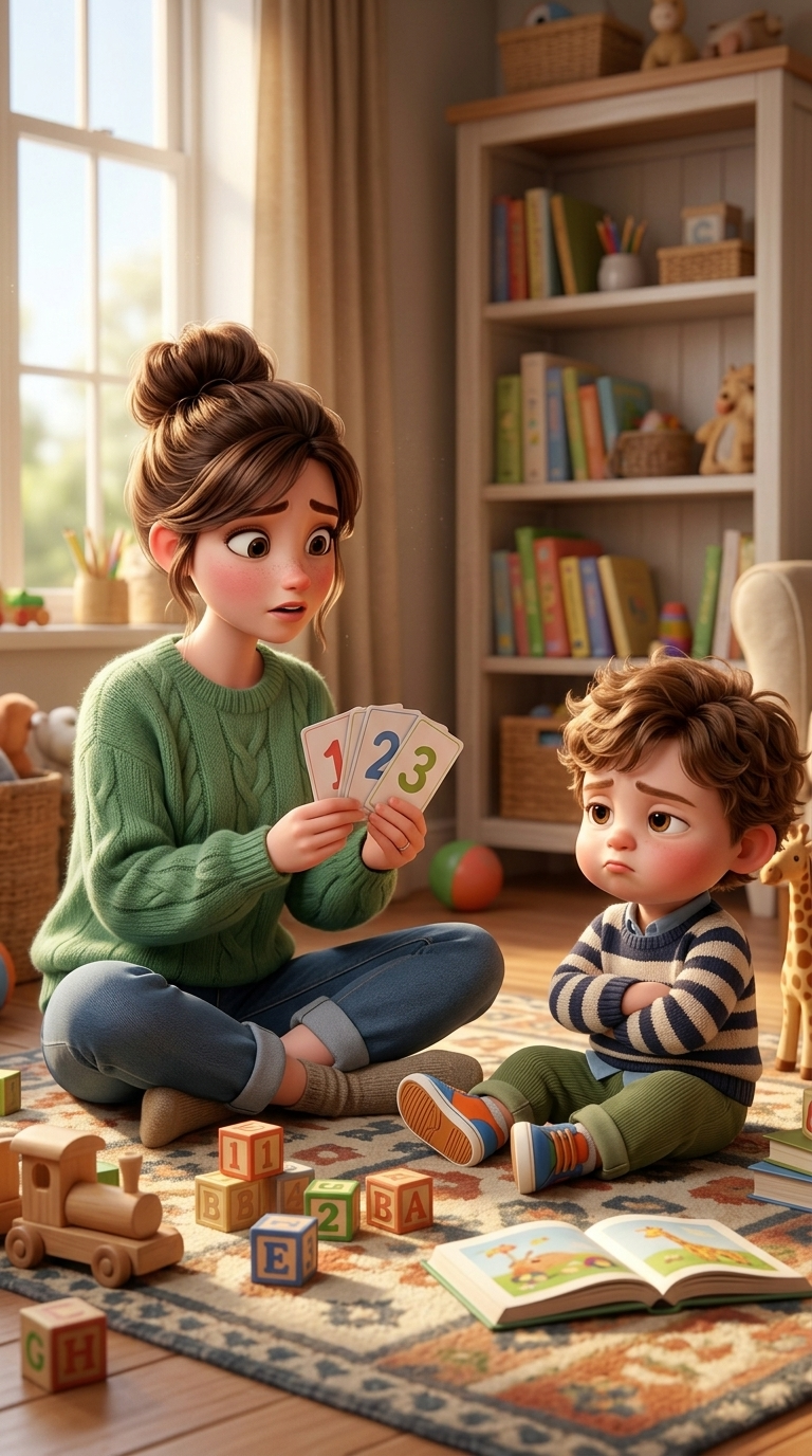 Medium shot. The mother holds up a card. The toddler slightly pulls back and shakes his head gently. Smooth camera pan.