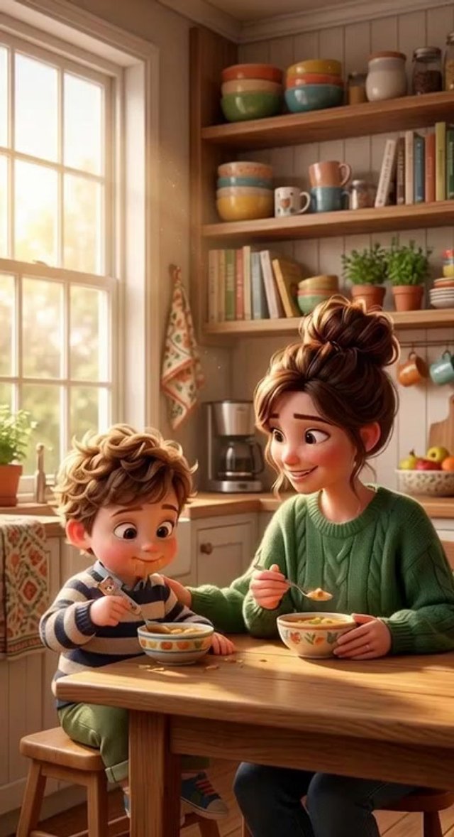 Средний план. Малыш осторожно зачерпывает суп ложкой и подносит ее ко рту. Мать ест рядом с ним, обмениваясь с ним теплым взглядом. Малыш...