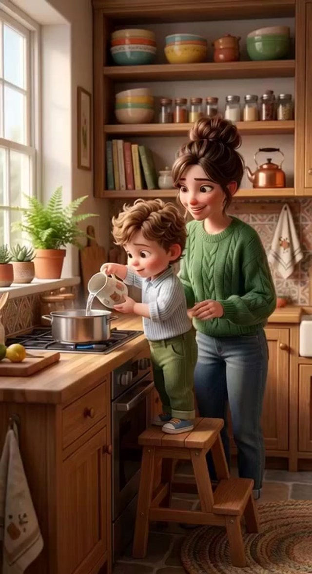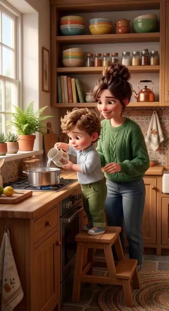 Средний план. Малыш аккуратно наклоняет кувшин, наливая воду в кастрюлю. Мать смотрит на него с любящим, поддерживающим выражением лица. ...
