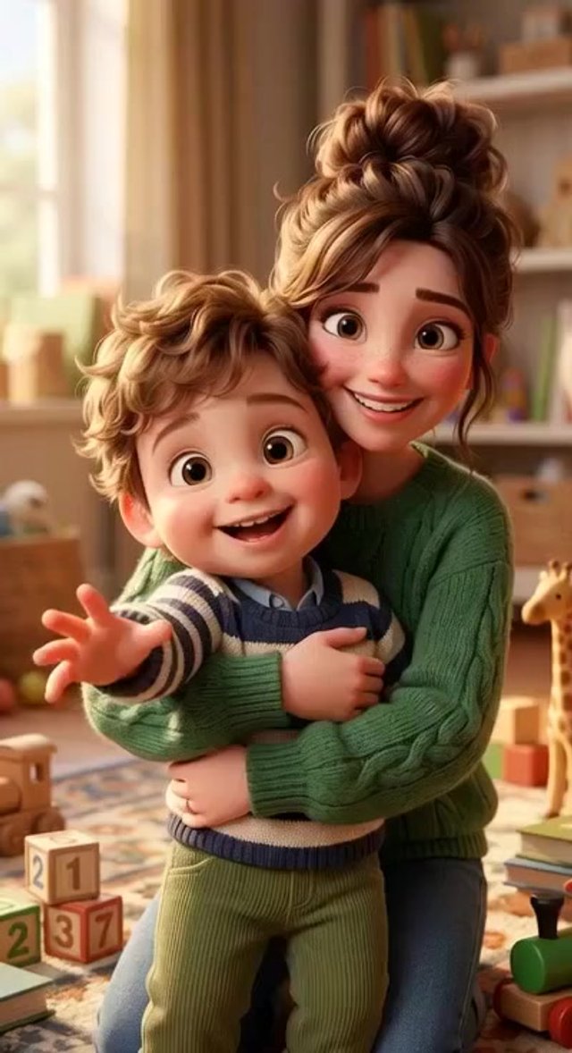 Strong rule: style --- 3D Pixar animation, cinematic lighting, highly ... ---. Young loving mother, gentle warm smile, kind eyes, soft ha...