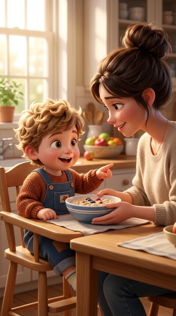 Strong rule: style --- 3D Pixar style, cinematic lighting, highly deta... ---. Малыш за кухонным столом смотрит на маму и показывает паль...