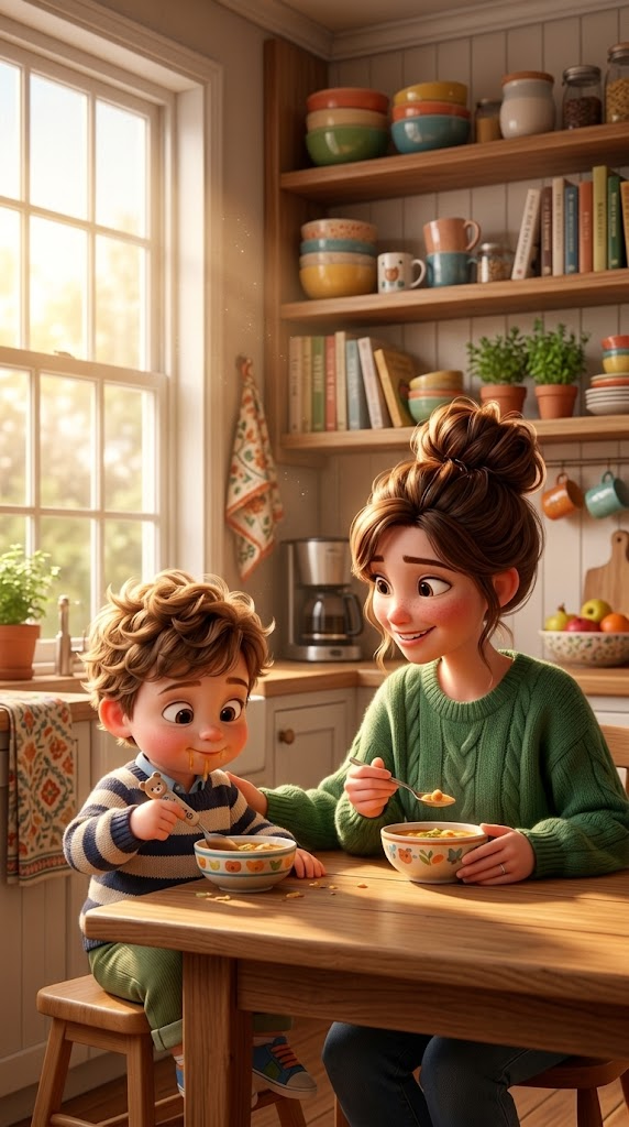 A bright, cozy kitchen. The toddler sits at a wooden table eating soup wi...