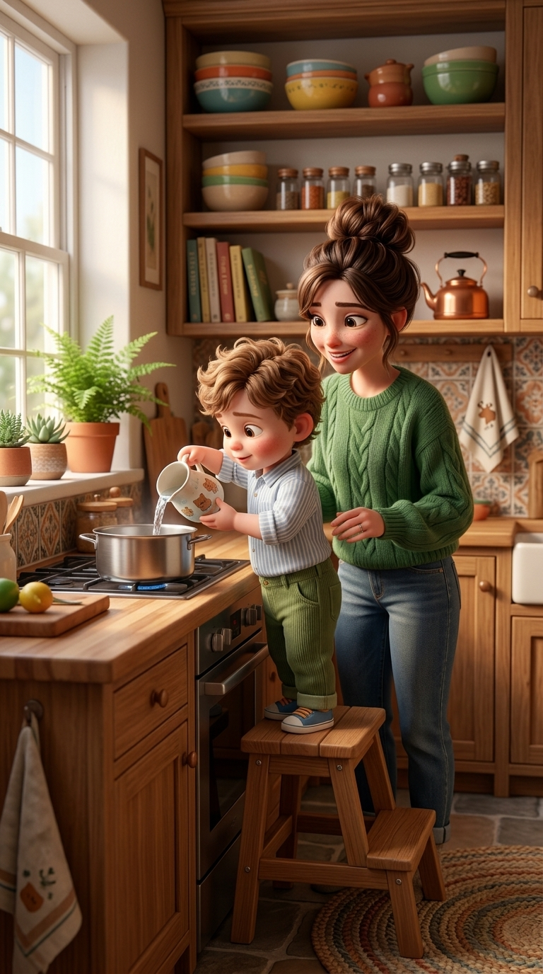 A cozy kitchen. The toddler stands on a sturdy wooden step stool next to ...