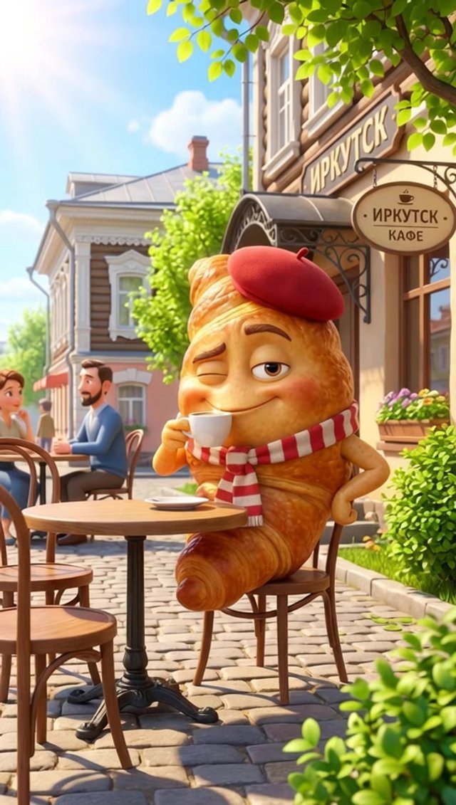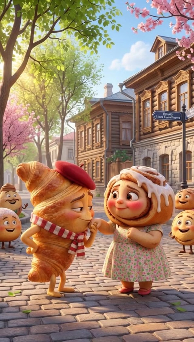 Smooth zoom in on the Croissant kissing her hand, romantic soft-focus background, dynamic angle.