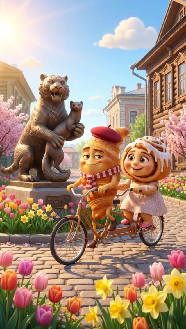 Tracking shot of the characters riding the bike, joyful and dynamic movement.