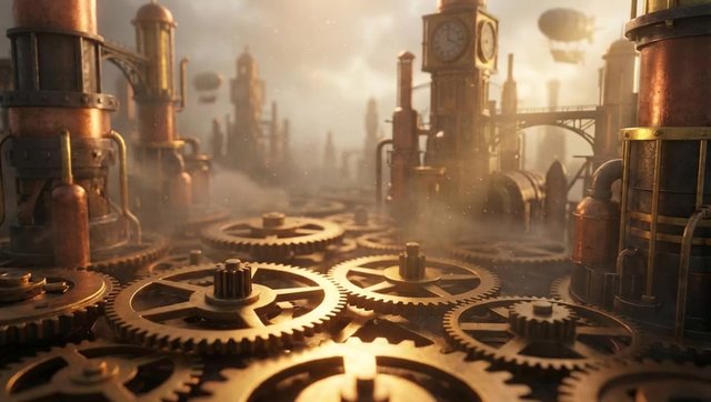 Strong rule: style --- Macro Photorealism, Steampunk, Cinematic Lighti... ---. A vast steampunk city entirely made of watch parts, giant ...