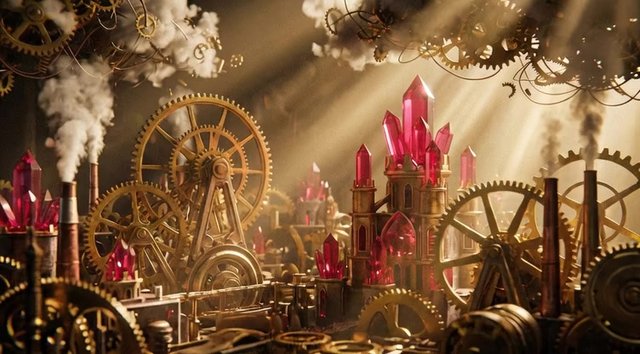 Aerial drone shot flying smoothly through the golden mechanical city, passing closely by giant spinning gears and glowing ruby crystals.
