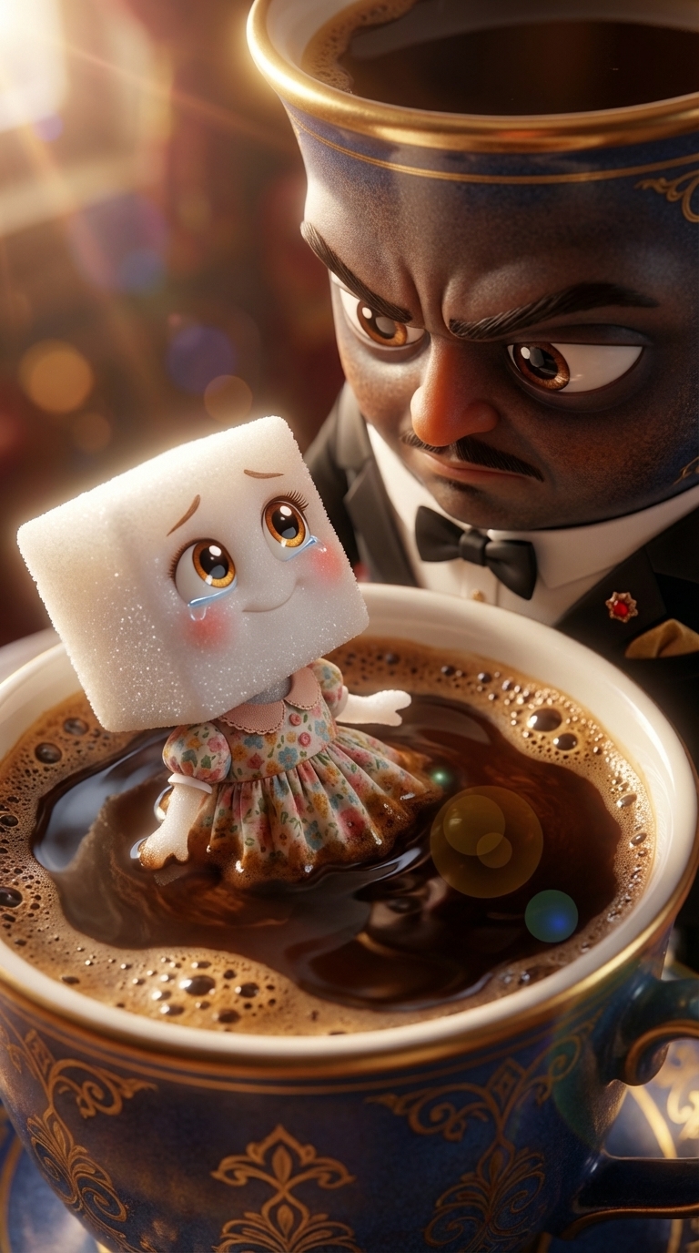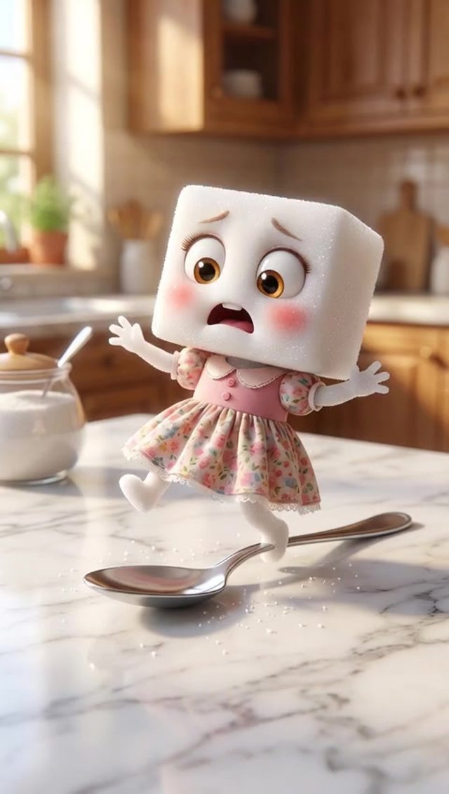 Strong rule: style --- 3D Pixar ---. Eda, a cute anthropomorphic sugar cube in a floral dress, is tripping over a silver spoon on the mar...