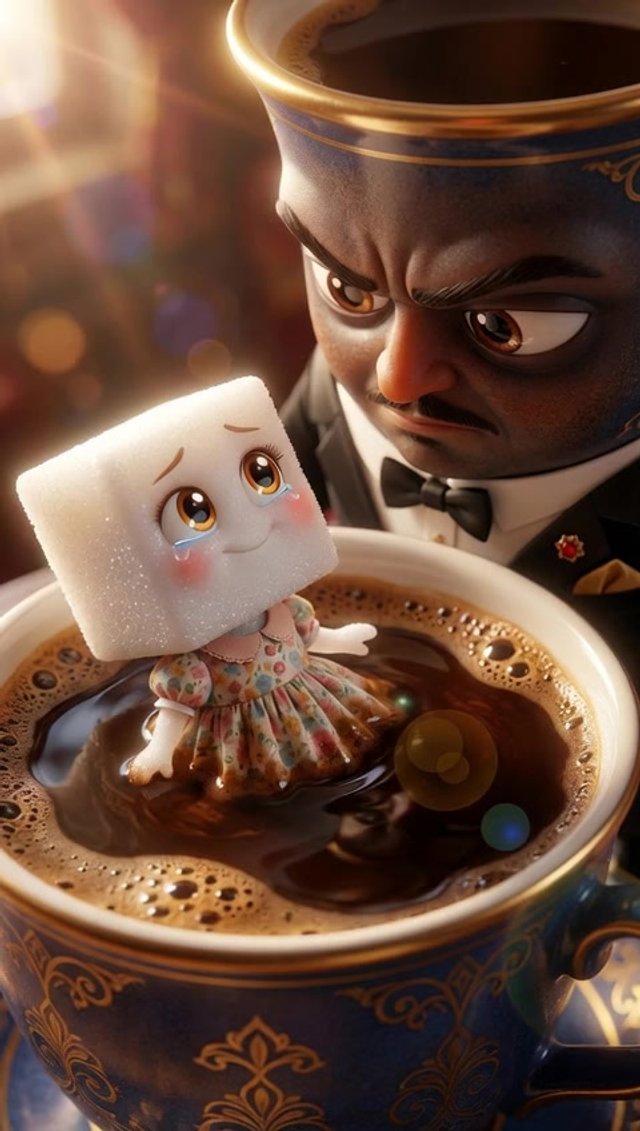 Strong rule: style --- 3D Pixar ---. Close-up shot. Eda is now half-submerged inside Serkan's dark coffee. They are staring deeply into e...