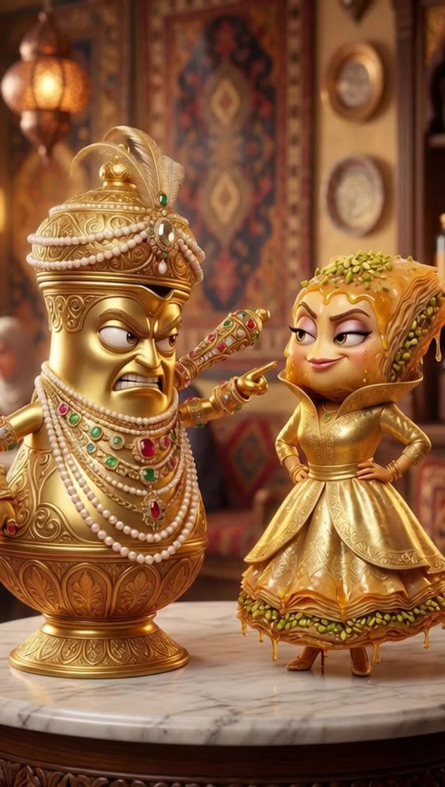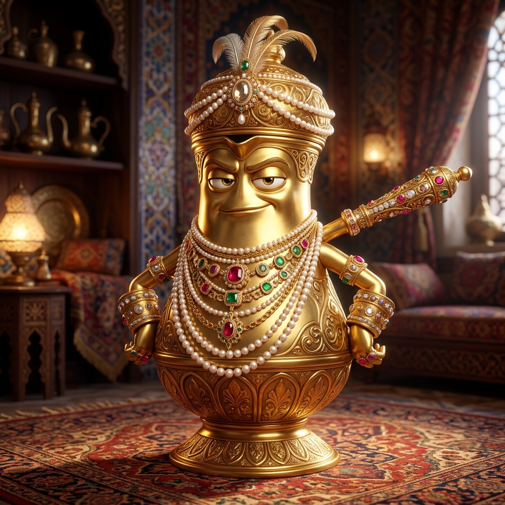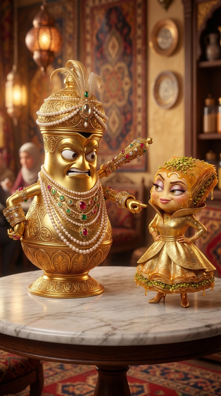 Strong rule: style --- 3D Pixar ---. An imposing, wealthy anthropomorphic golden cezve (Turkish coffee pot) with a haughty expression, we...