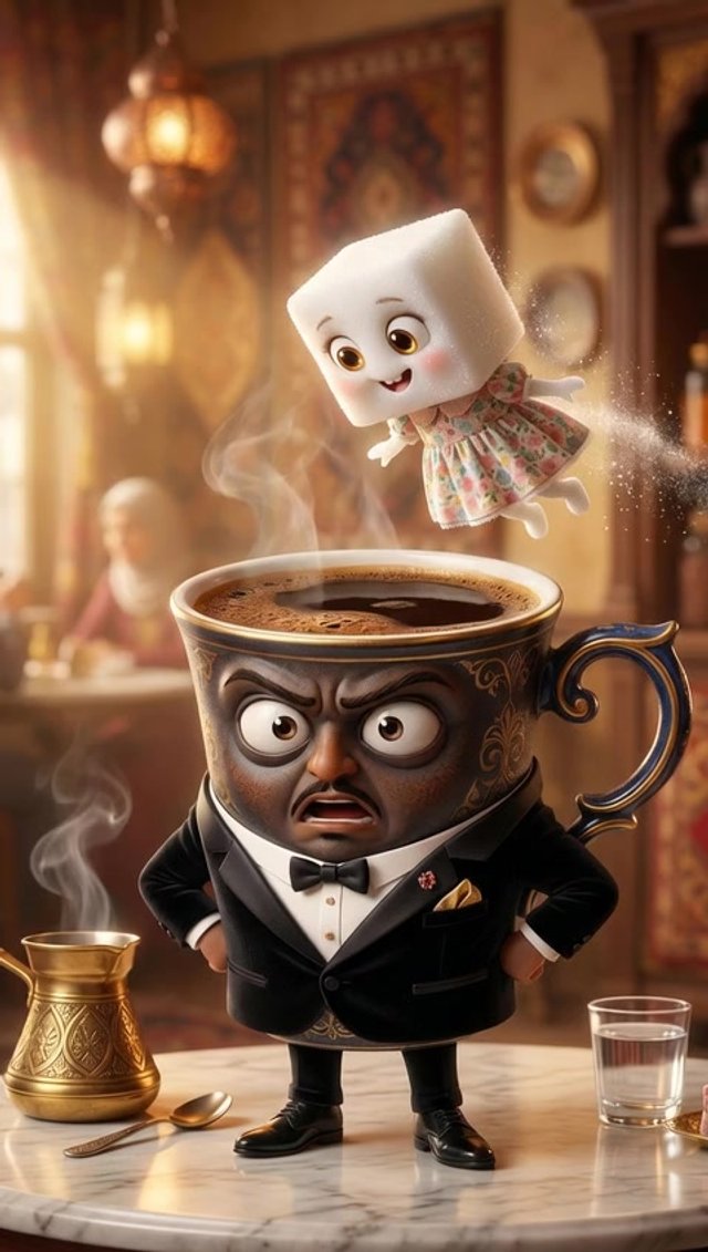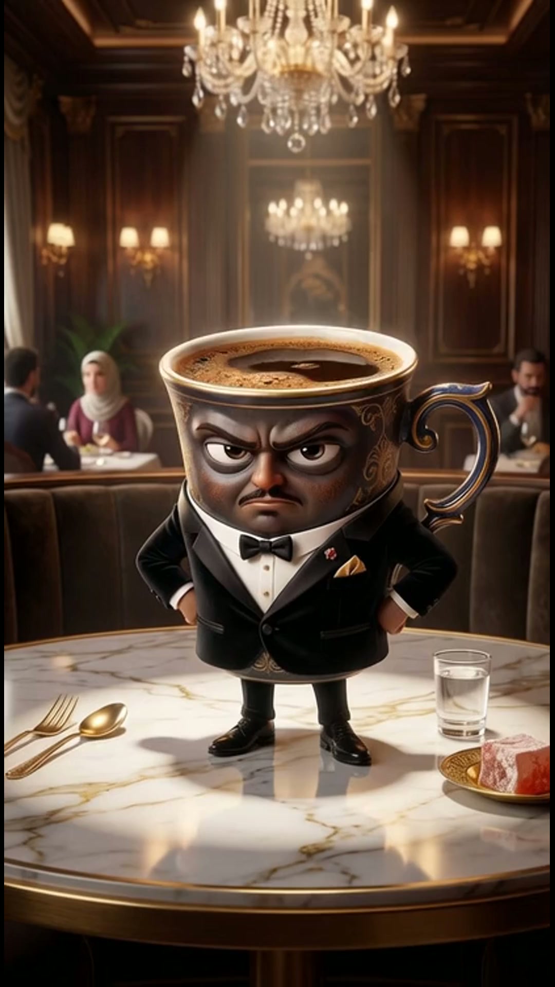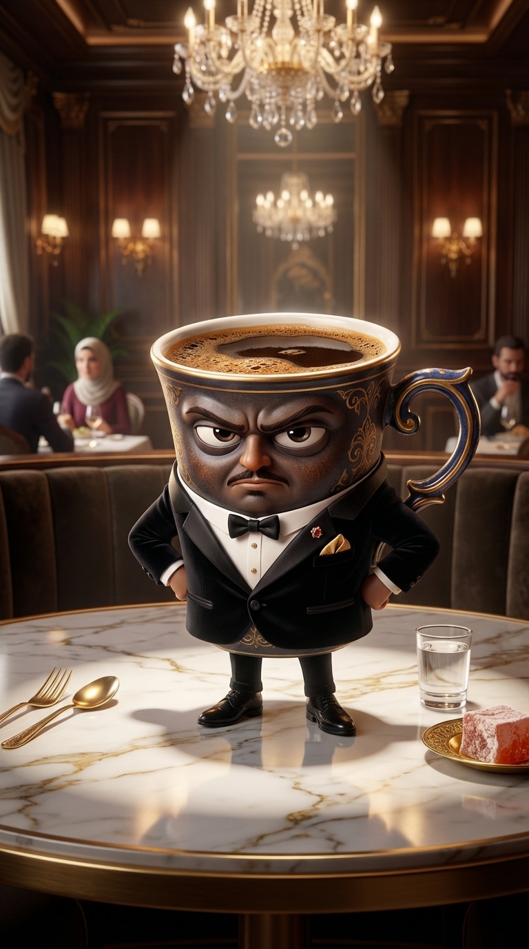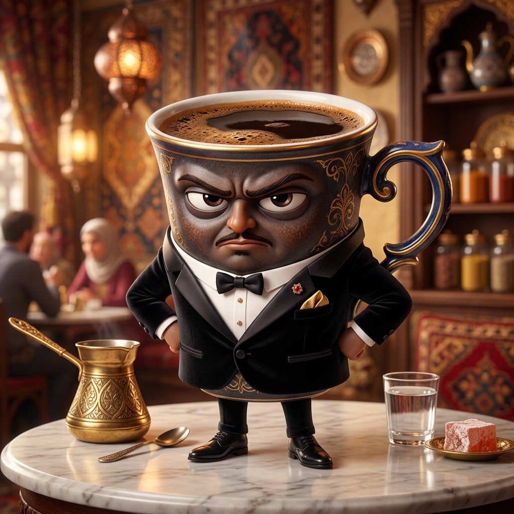 Strong rule: style --- 3D Pixar ---. An anthropomorphic cup of black Turkish coffee with a serious, arrogant face, wearing a tiny elegant...