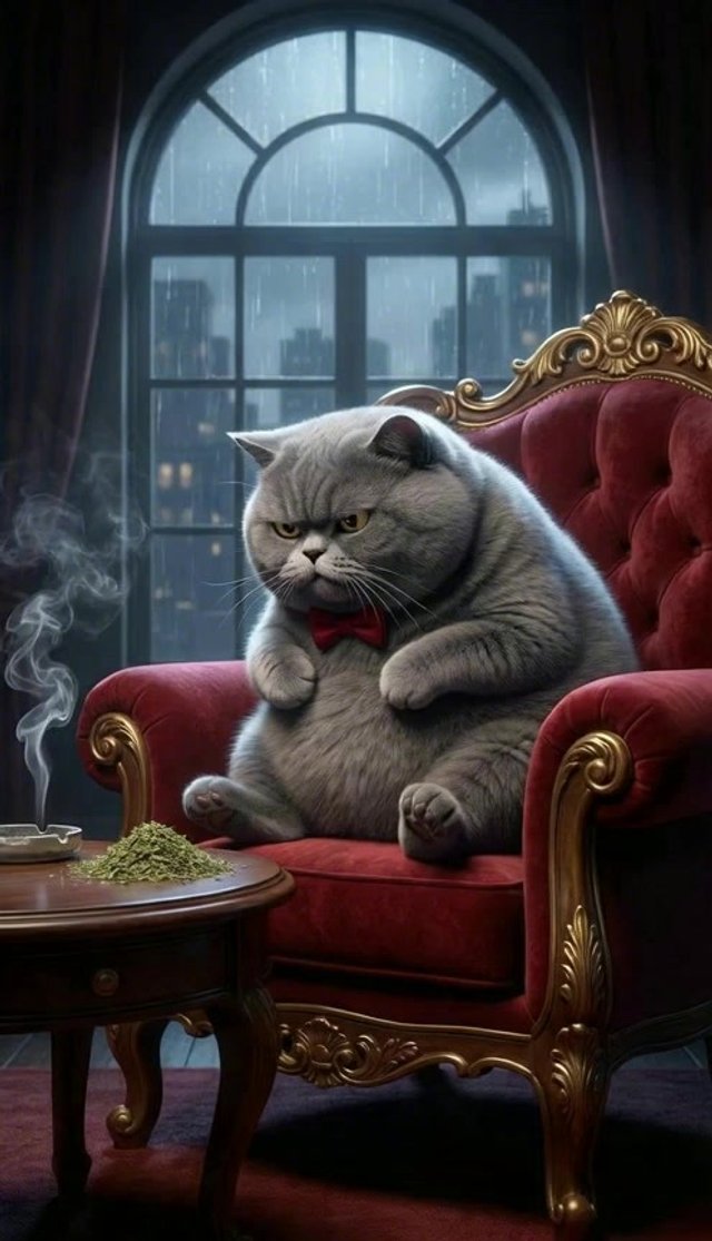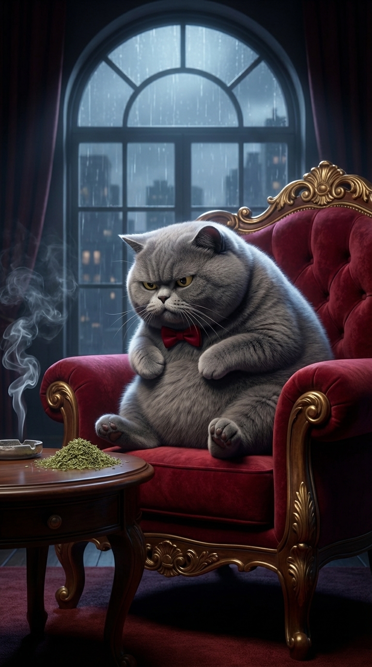 Strong rule: style --- 3D Pixar, cinematic lighting, neo-noir crime mo... ---. A fat grey British cat sitting on a luxurious velvet cat t...