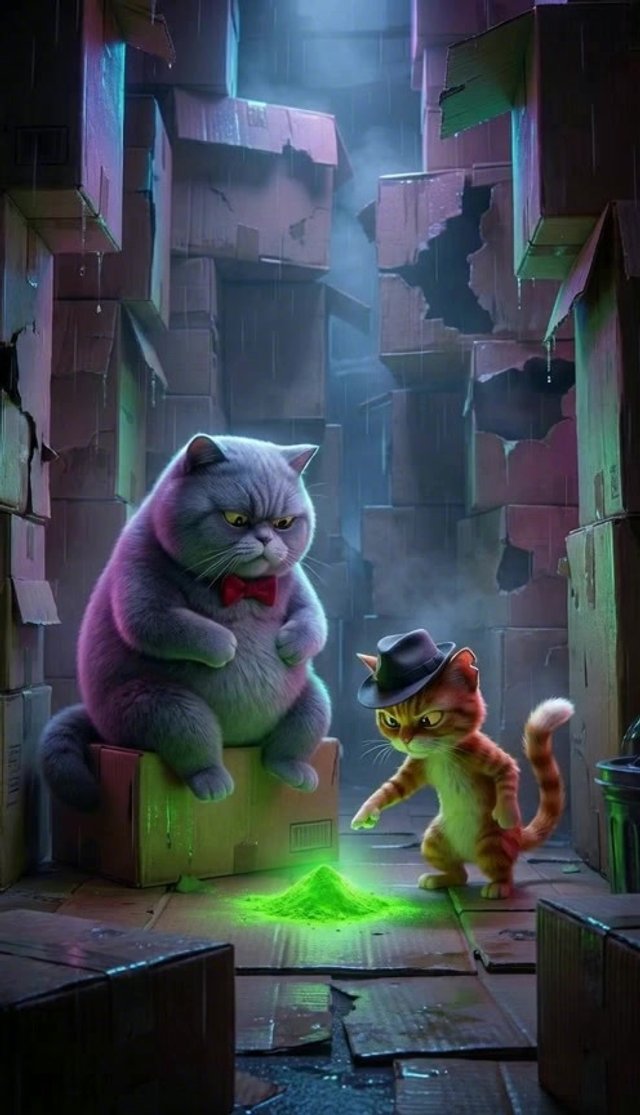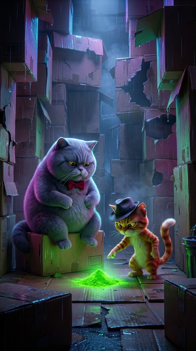 Strong rule: style --- 3D Pixar, cinematic lighting, neo-noir crime mo... ---. The skinny ginger cat standing next to the fat grey cat in...