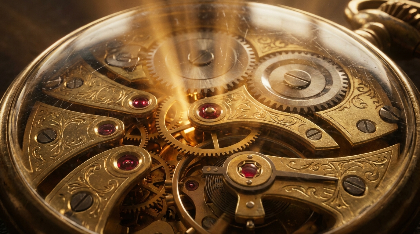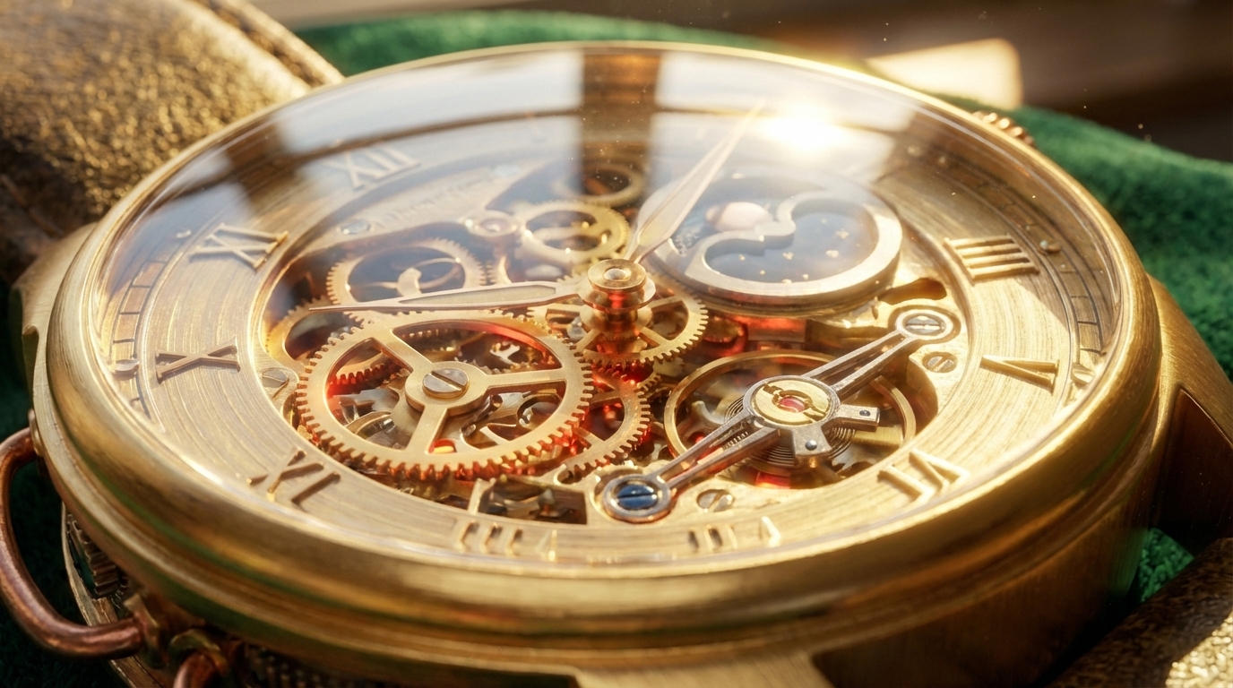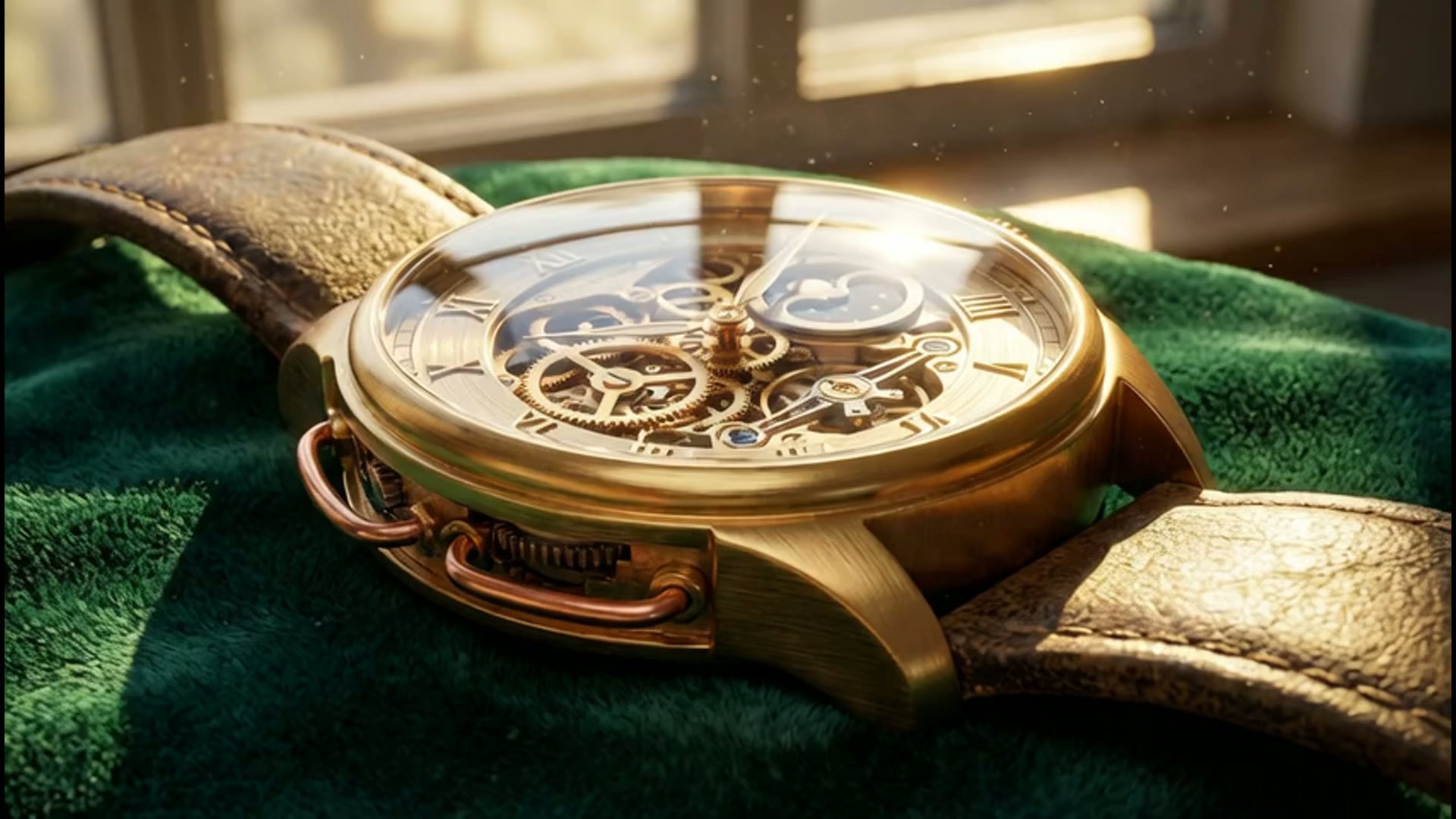 Strong rule: style --- Macro Photorealism, Steampunk, Cinematic Lighti... ---. A surreal transition where macro watch gears transform int...