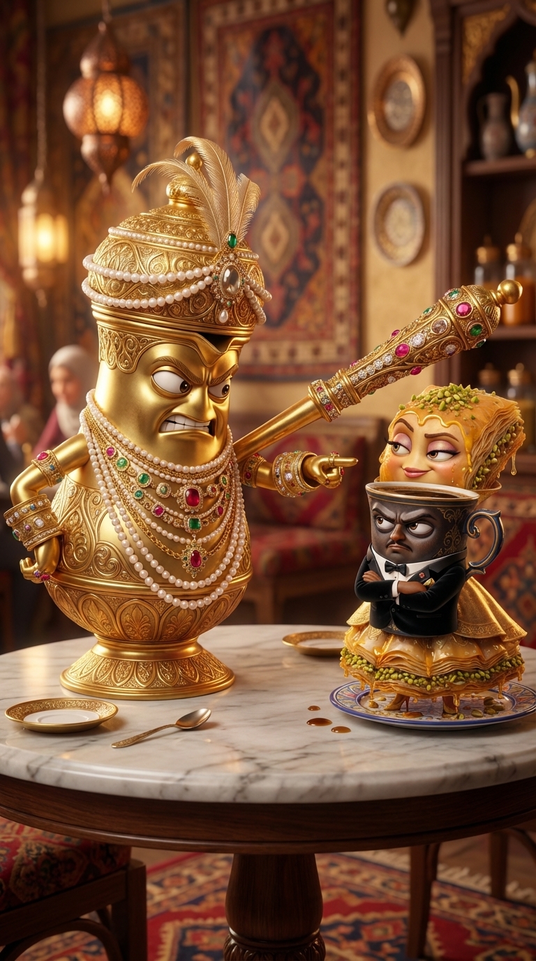 Strong rule: style --- 3D Pixar ---. The Golden Cezve mother stands furiously on the table, pointing an angry handle at the cup. Next to ...