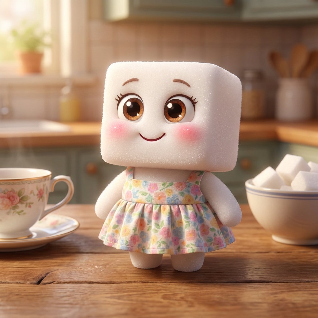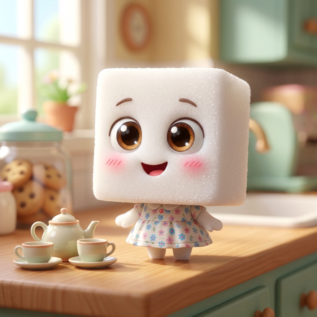 Strong rule: style --- 3D Pixar ---. A cute, anthropomorphic white sugar cube with big expressive eyes, blushing cheeks, and a sweet smil...