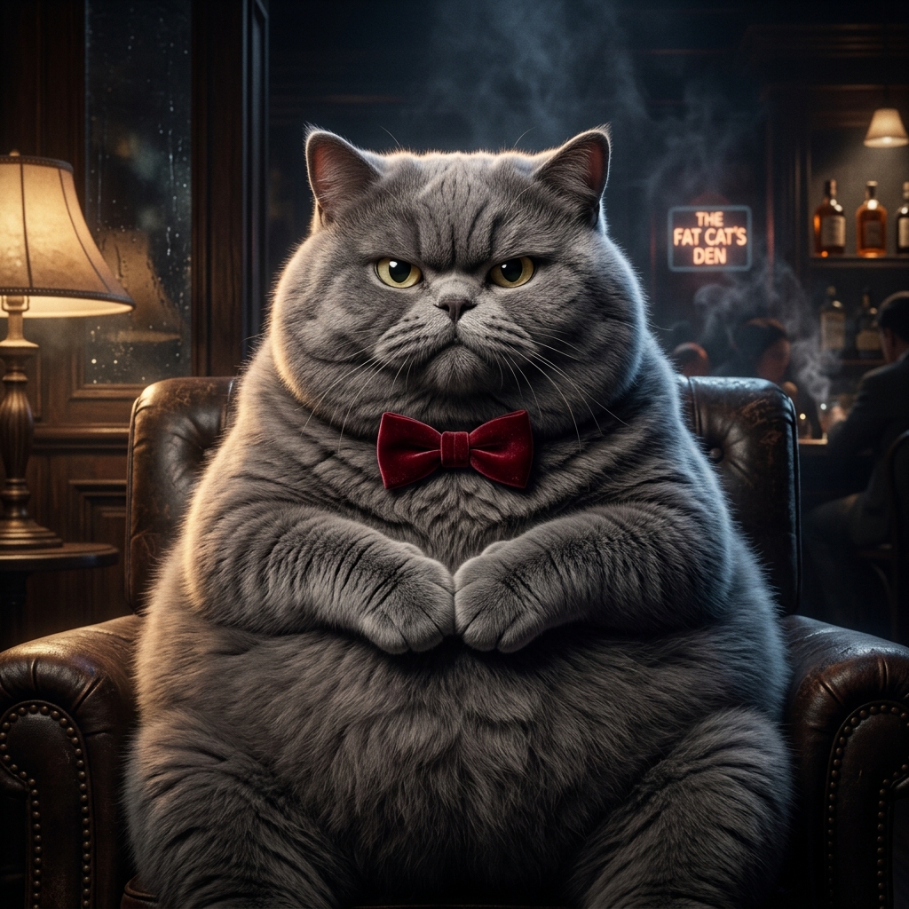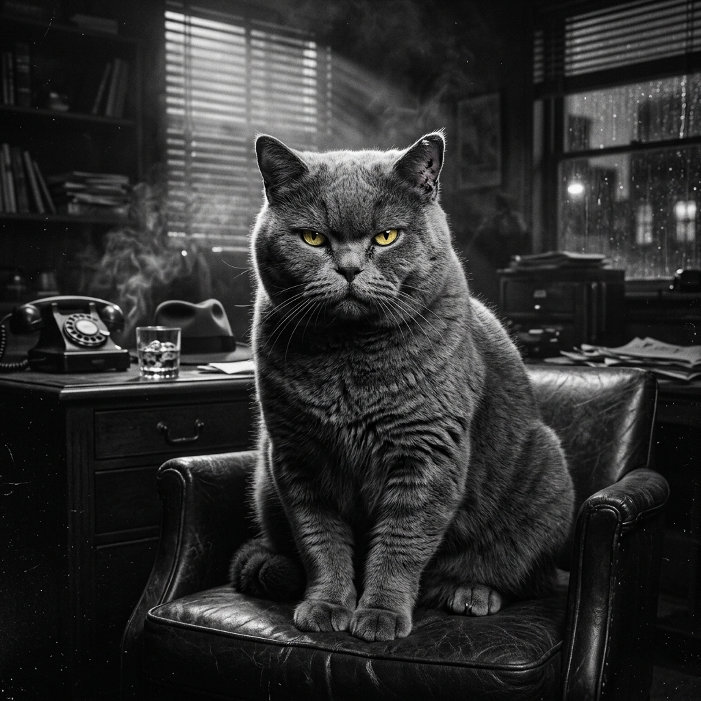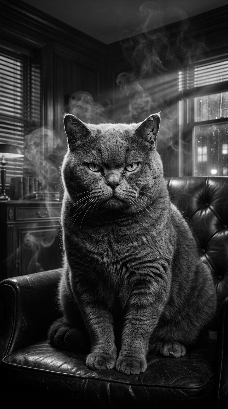 Strong rule: style --- Cinematic Film Noir, realistic animals with exp... ---. Close up of a fat grey British Shorthair cat (Don Barsik) ...