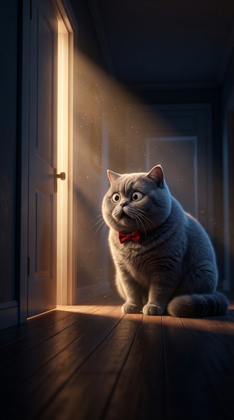 Strong rule: style --- 3D Pixar, cinematic lighting, neo-noir crime mo... ---. The fat grey British cat looking shocked and betrayed, sta...